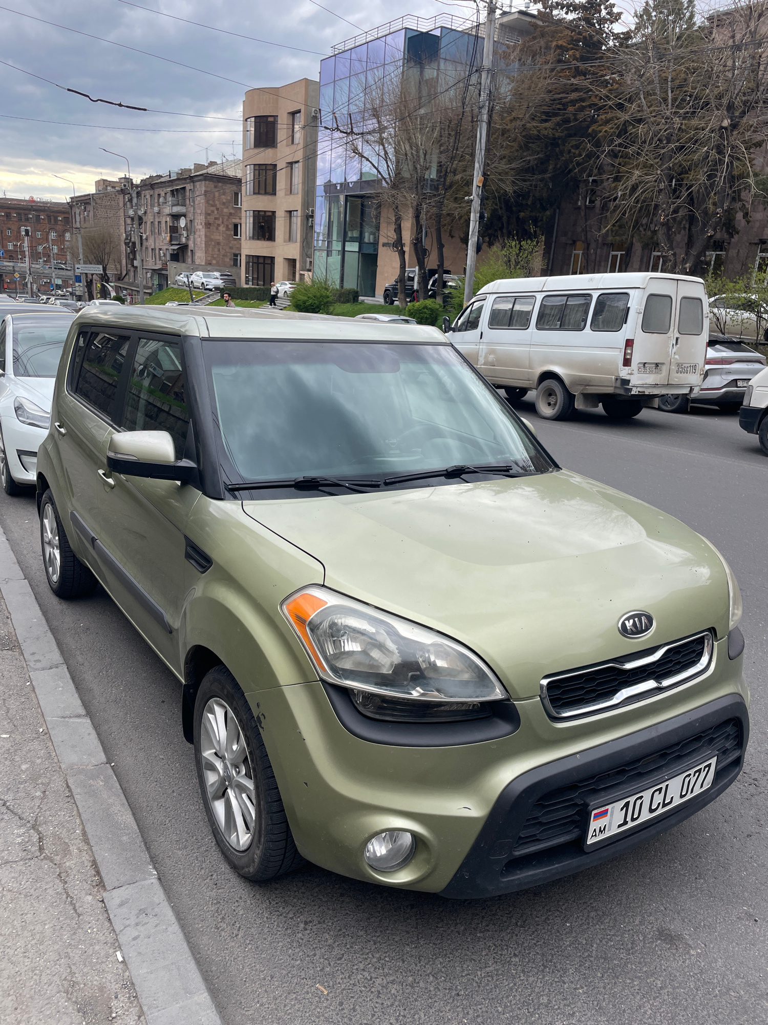 A light-green Kia Soul is parked on a city street in Yerevan, Armenia. Its license plate reads "AM 10 CL 077". A white van is parked behind it. The scene is an urban environment, showing buildings of…read more