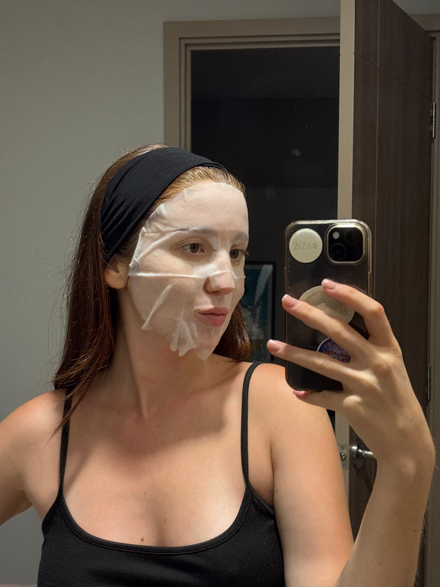 A woman is taking a selfie indoors while wearing a sheet face mask and a black headband. She is holding her smartphone with her right hand, obscuring part of her face. The phone has a black case and d…read more