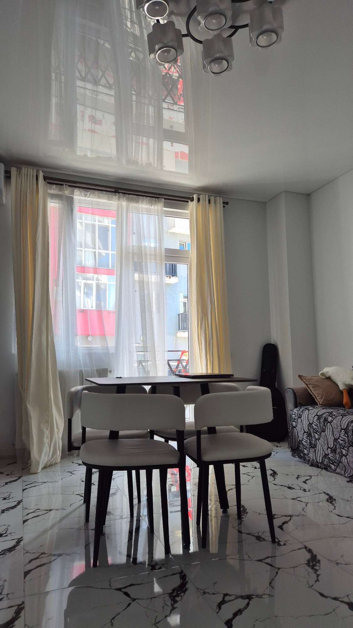 The image shows the interior of a room, possibly an apartment or hotel room, in Batumi, Georgia. The room has a window with sheer white curtains and heavier cream-colored curtains along the top and bo…read more