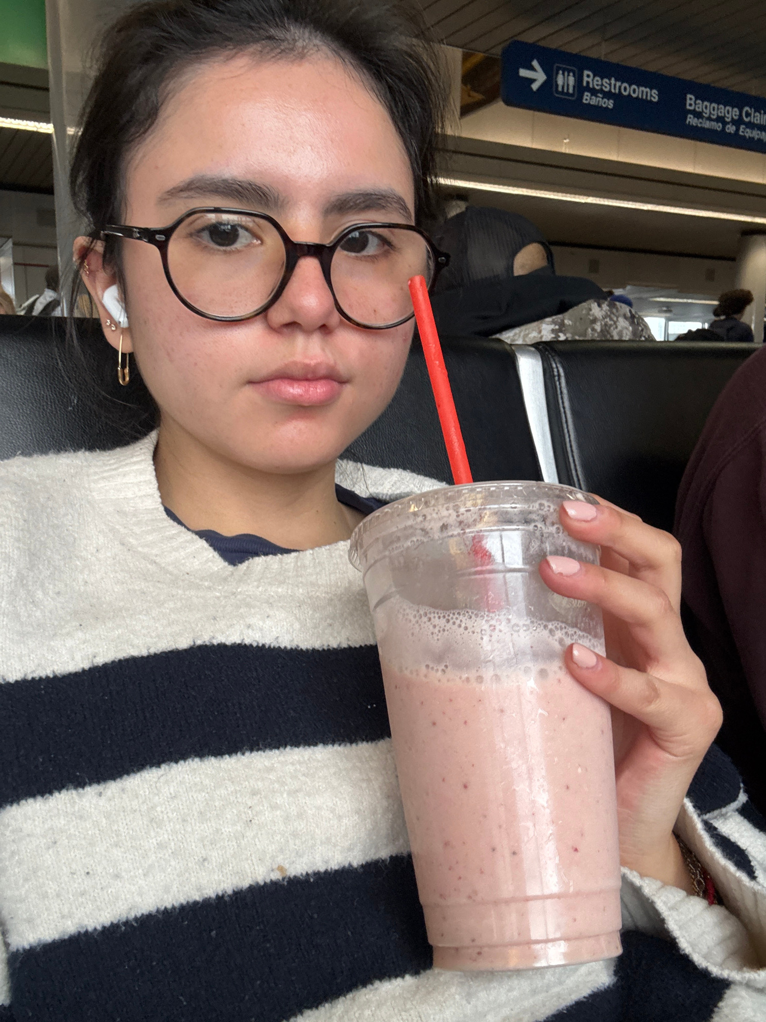 A young woman is seated in an airport terminal. The woman is fair-skinned, with dark hair pulled back, and wearing round glasses. She has multiple earrings in her left ear and is wearing a black and w…read more