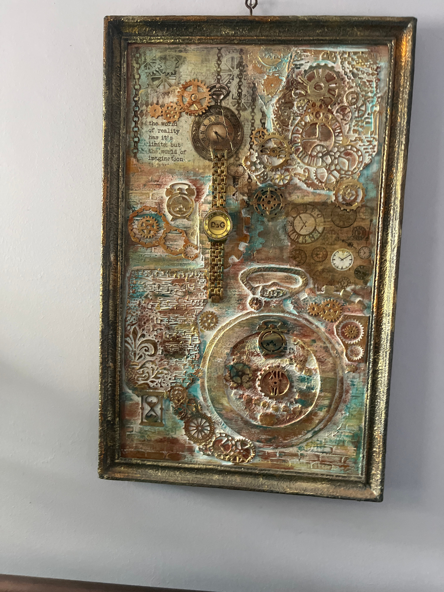 The image shows a framed piece of art hanging on a white wall. The artwork itself is a mixed media collage in a steampunk style. It incorporates various gears, clock faces, chains, and decorative flou…read more