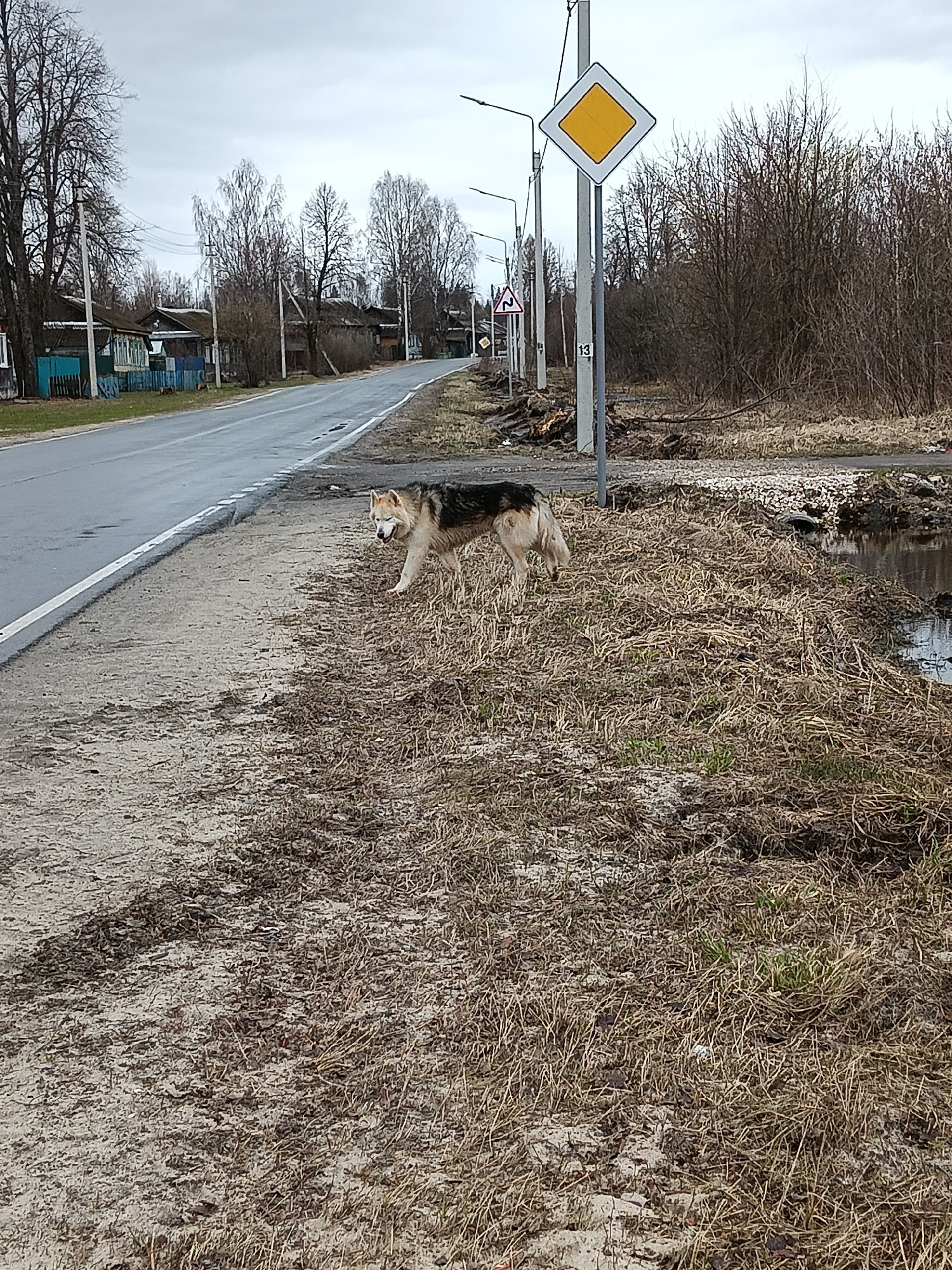 The scene depicts a rural roadside in Красный Маяк, Russia. A medium-sized dog, appearing to be a German Shepherd mix, stands on a grassy verge beside a paved road. The verge consists of sand, mud, an…read more