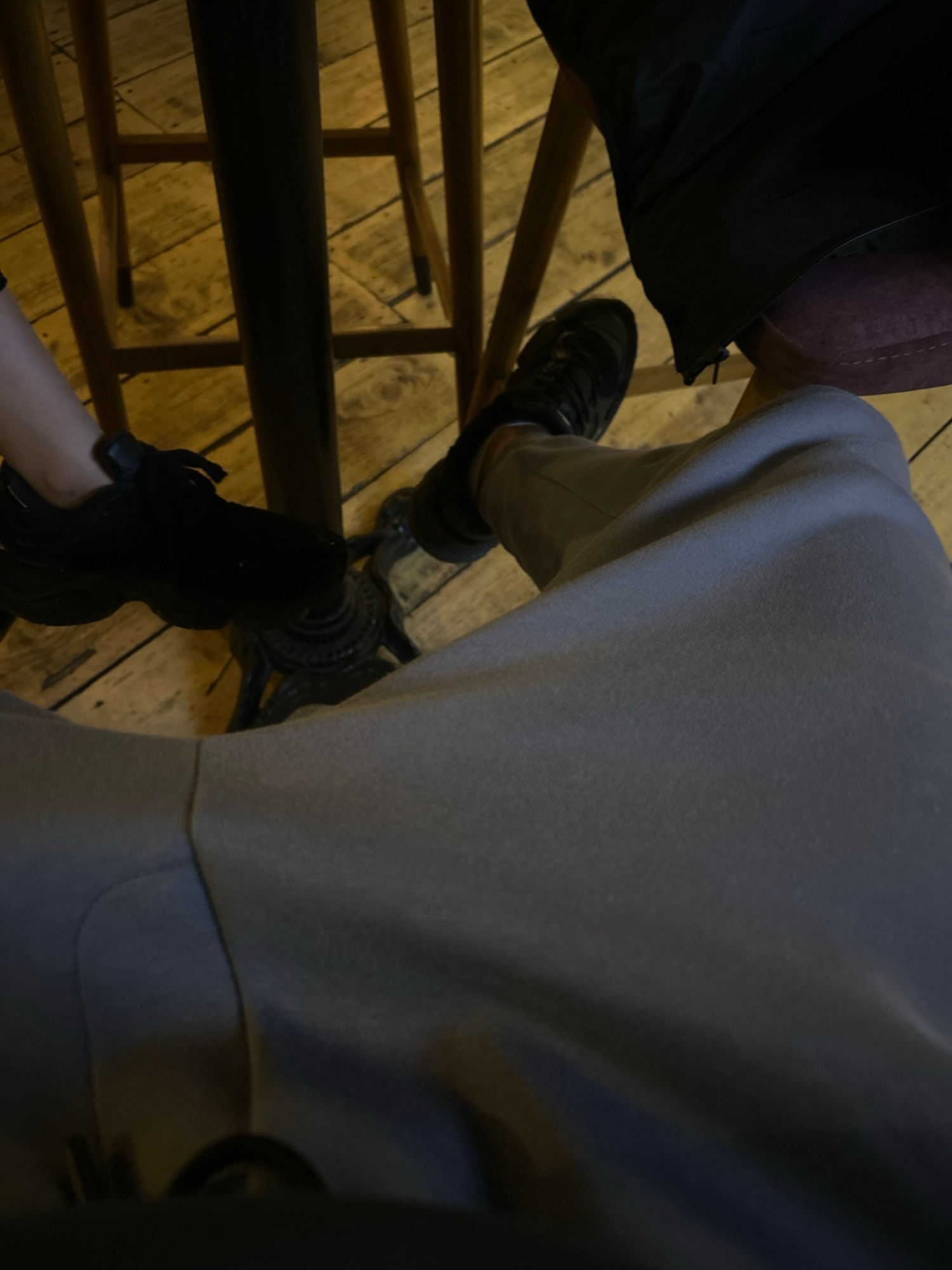 A person is standing on a wooden spiral staircase, likely indoors. The individual is wearing gray sweatpants and two different pairs of black shoes. The stairs appear to be made of light-colored wood,…read more