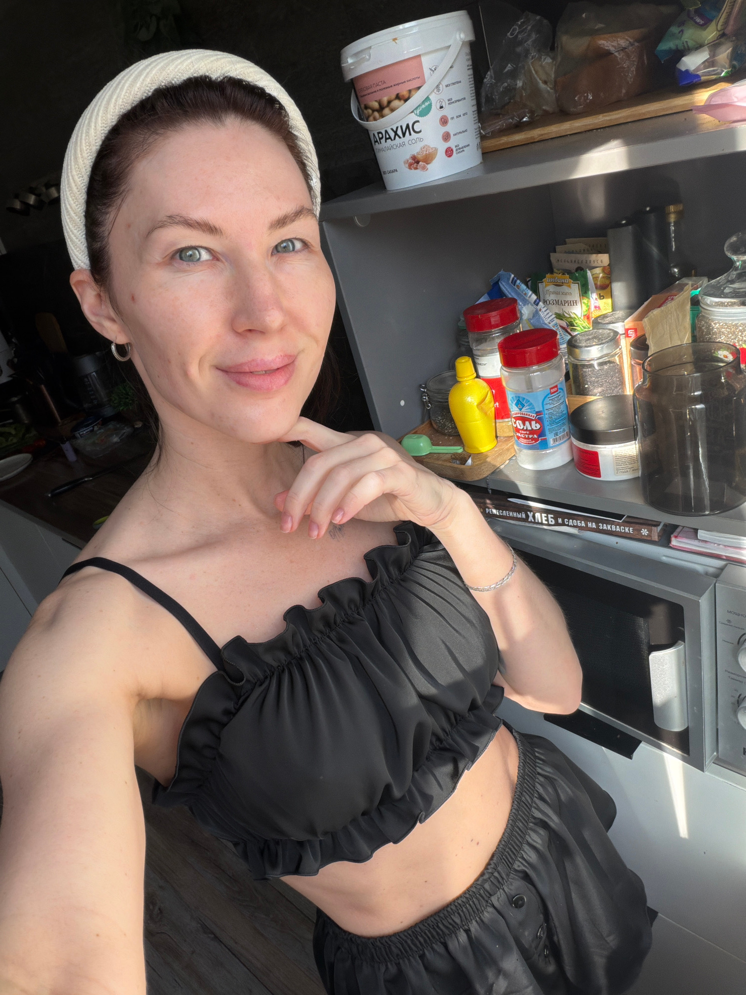 The image is a selfie taken indoors, appearing to be in a kitchen or pantry. The subject is a woman with light skin, wearing a white headband and a black, ruffled top. She is positioned to the right o…read more