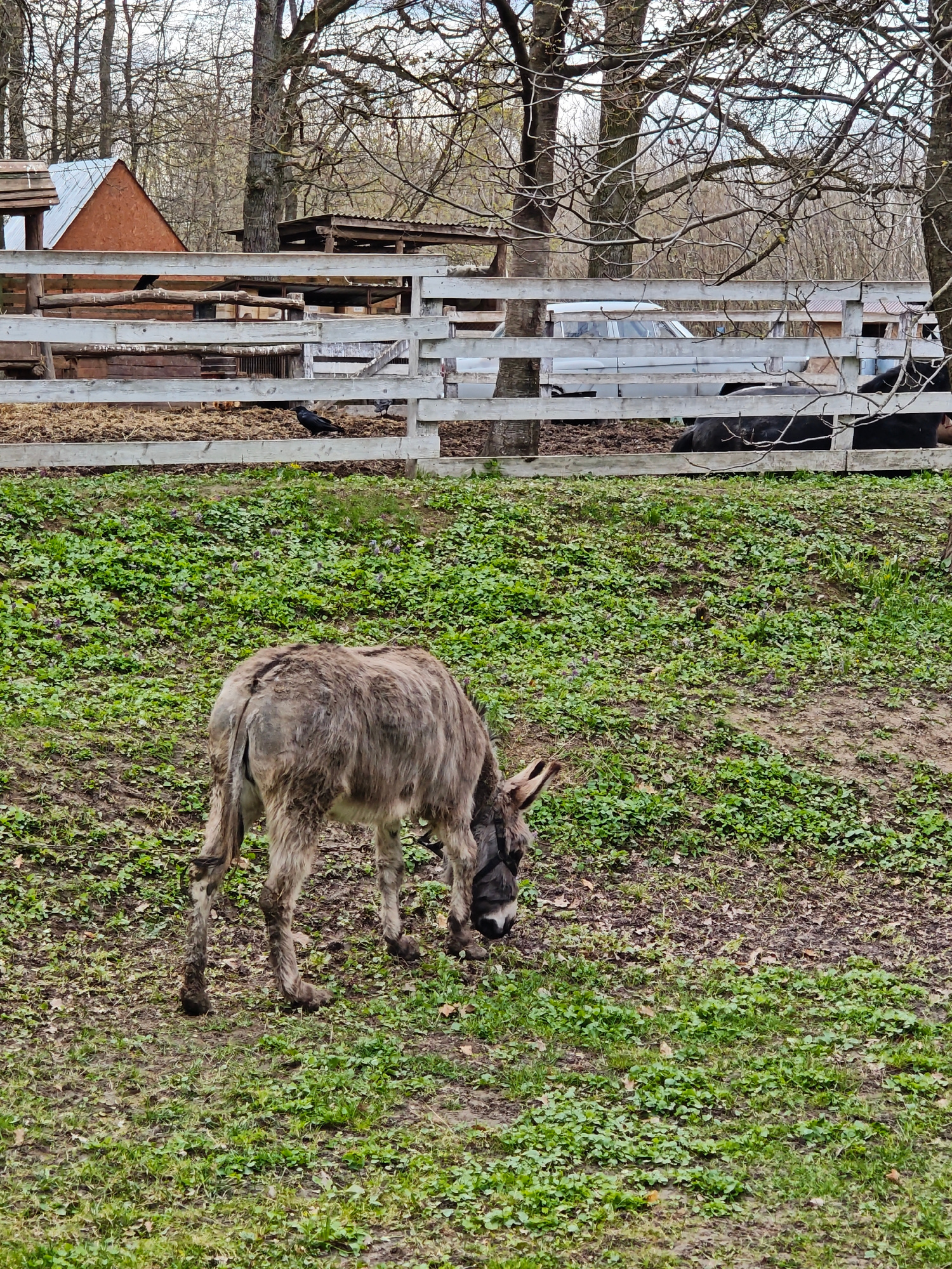 The image depicts a donkey grazing in a grassy area. In the background is a white wooden fence with what appears to be a vehicle and some structures partially visible behind it. There are also bare tr…read more