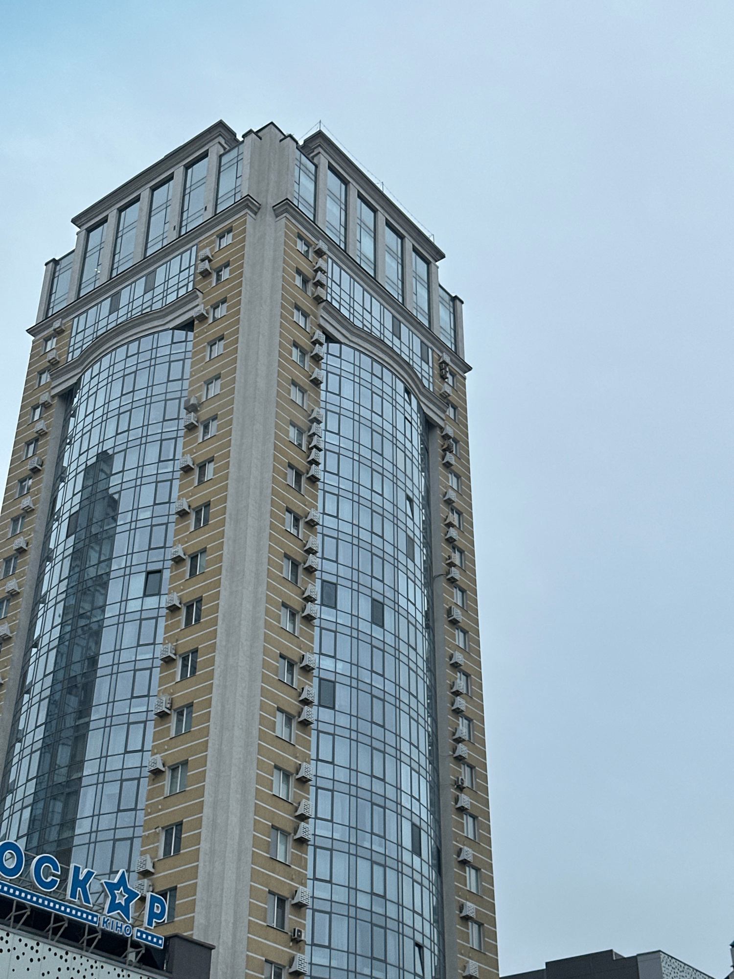 The image depicts a tall, modern building with a glass facade, likely located in Kyiv, Ukraine, based on the Cyrillic lettering on the building's sign which reads "Оскар кіно" (Oscar Kino). The buildi…read more