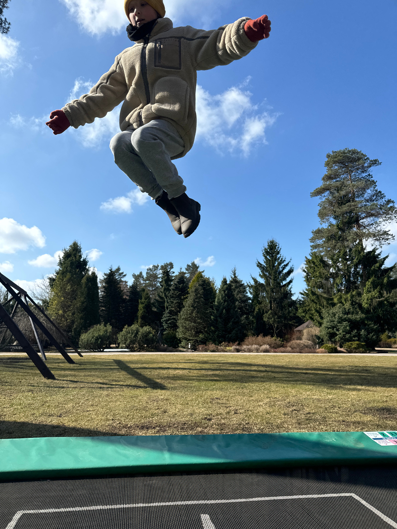 A young person is captured mid-air against a bright blue sky with scattered clouds. They wear a tan fleece jacket, grey sweatpants, black shoes, a yellow beanie, and red gloves. Their arms and legs ar…read more