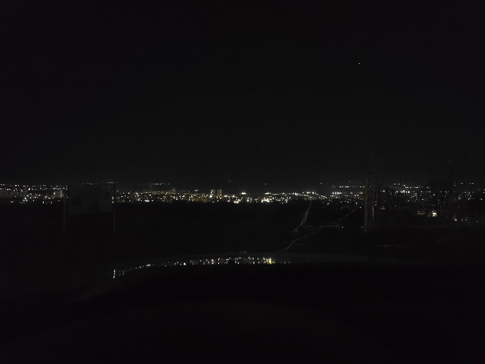 The image displays a nighttime panoramic view of the city of Yambol, Bulgaria, observed from an elevated, dark vantage point. The horizon is defined by a wide band of illuminated urban lights stretchi…read more