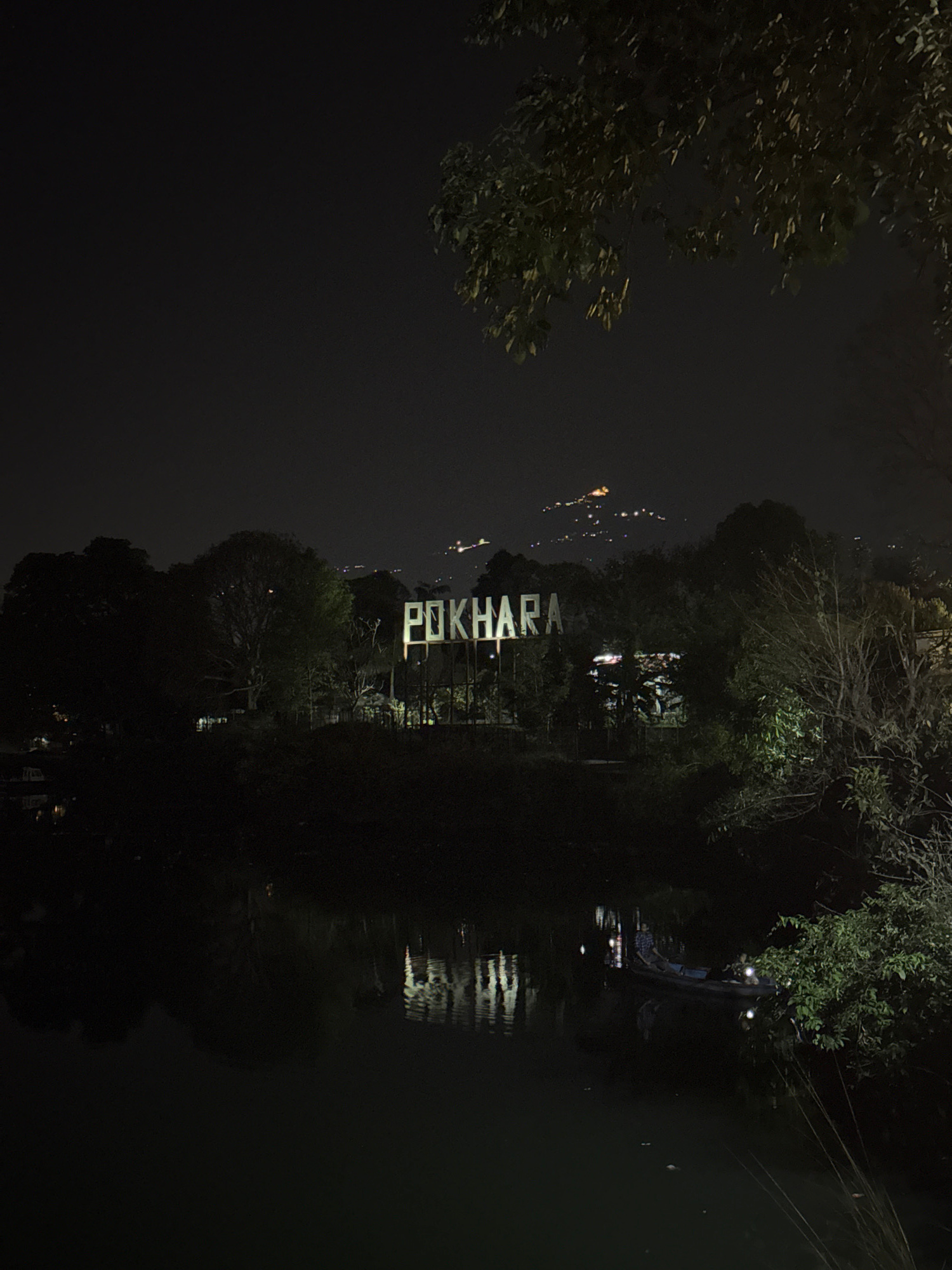 At night, illuminated block letters spelling "POKHARA" stand near a dark body of water, reflecting the sign. The area appears to be a park or natural setting with trees visible. In the distance, faint…read more