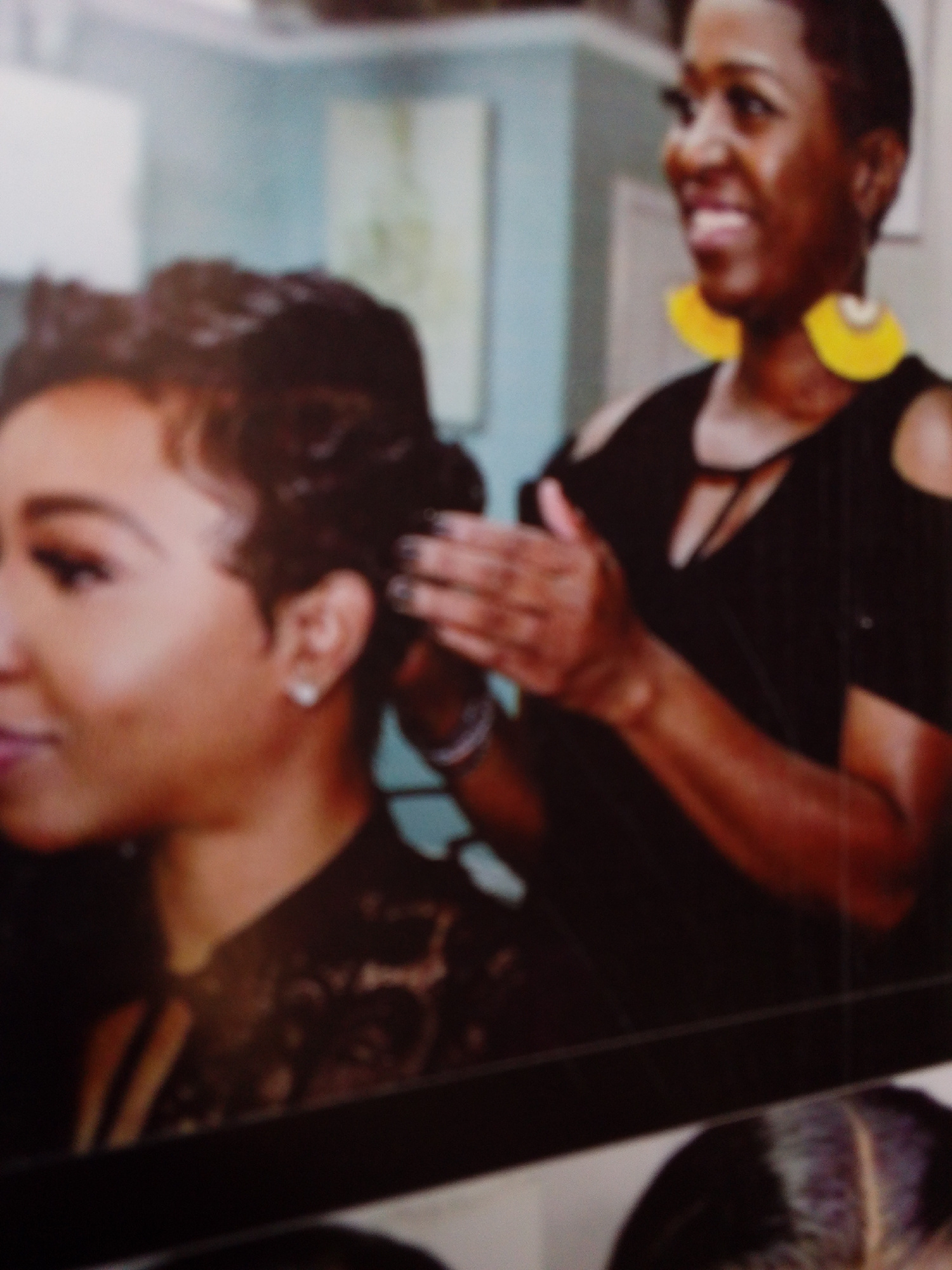 The image depicts two Black women. One woman is seated and has dark hair styled in a wave-like pattern. She is wearing a dark, possibly lace, top and a small earring. The other woman, standing behind…read more
