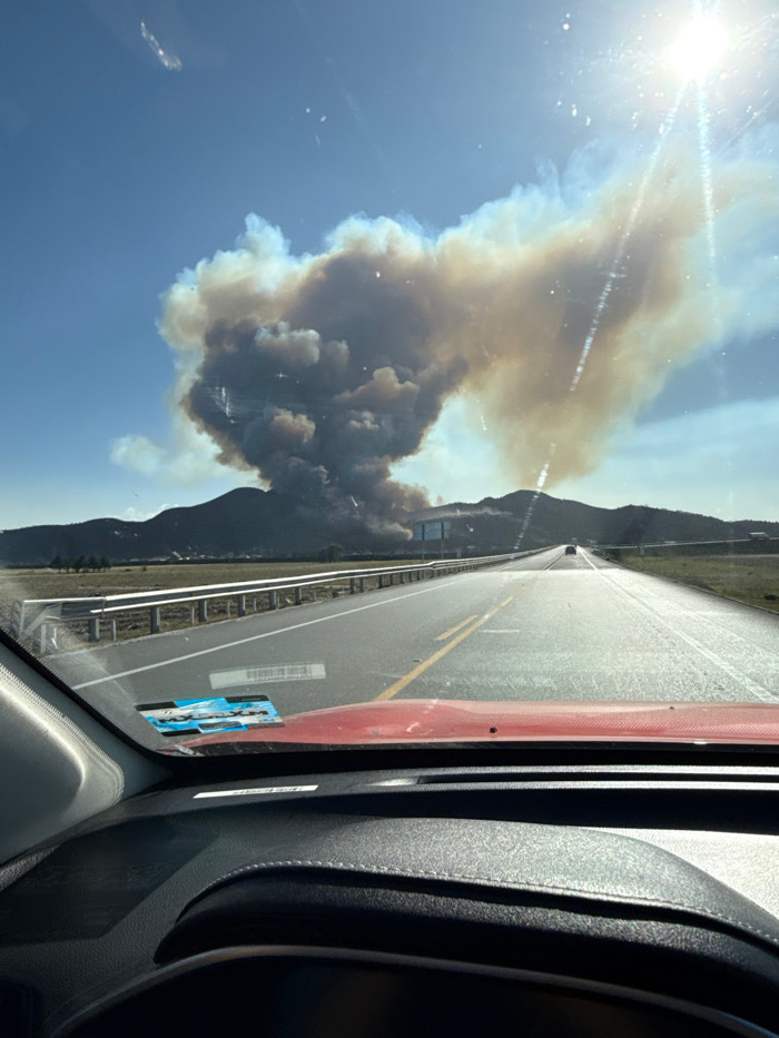 The image shows a wildfire viewed from inside a vehicle. A large plume of smoke fills the left side of the frame against a blue sky. The sun is visible above the smoke cloud. A road with a yellow line…read more