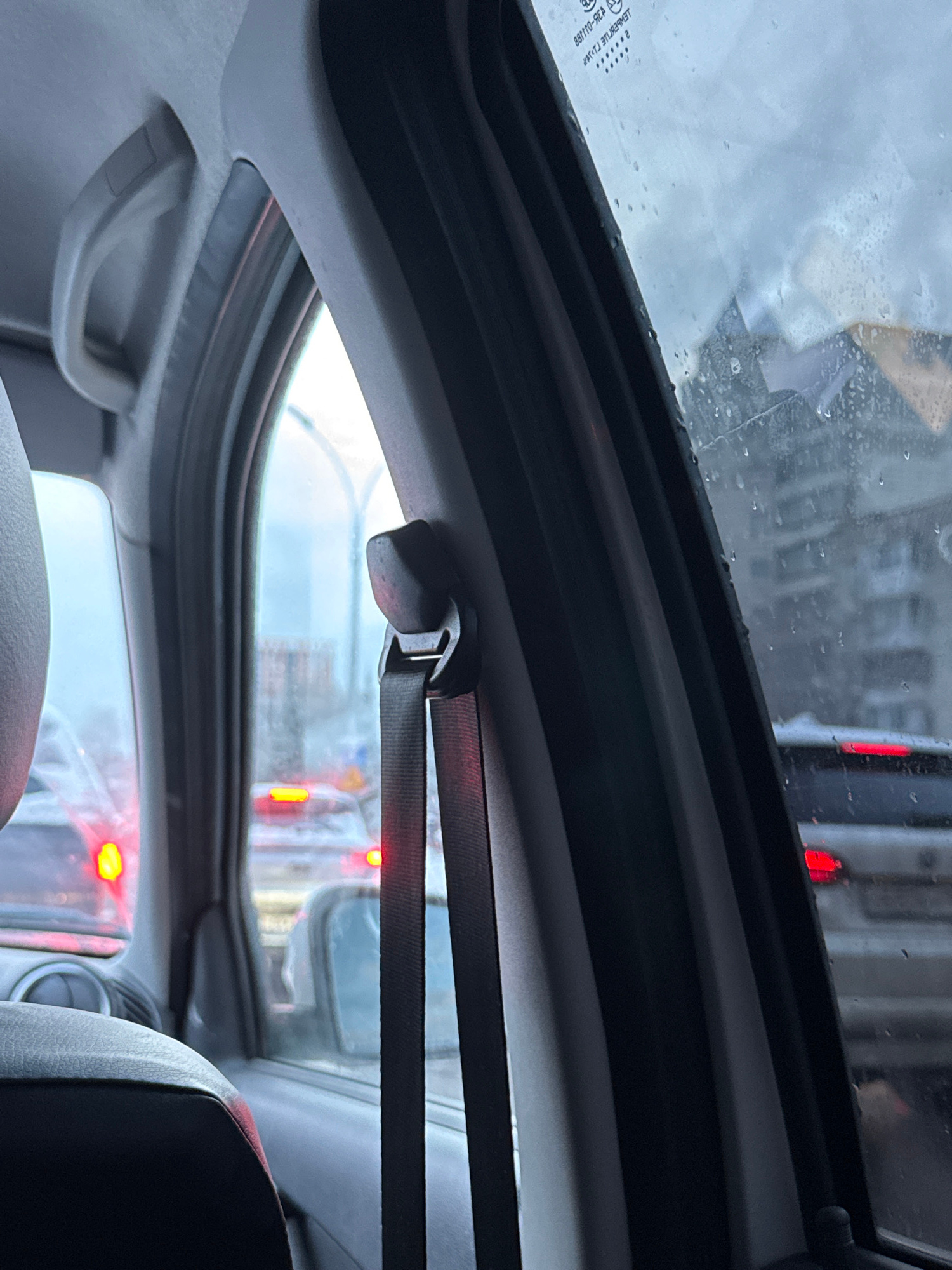 The image offers an interior perspective from a vehicle, looking upwards and forwards through a sunroof. The sunroof's frame is prominent, and its glass is covered in numerous water droplets, indicati…read more