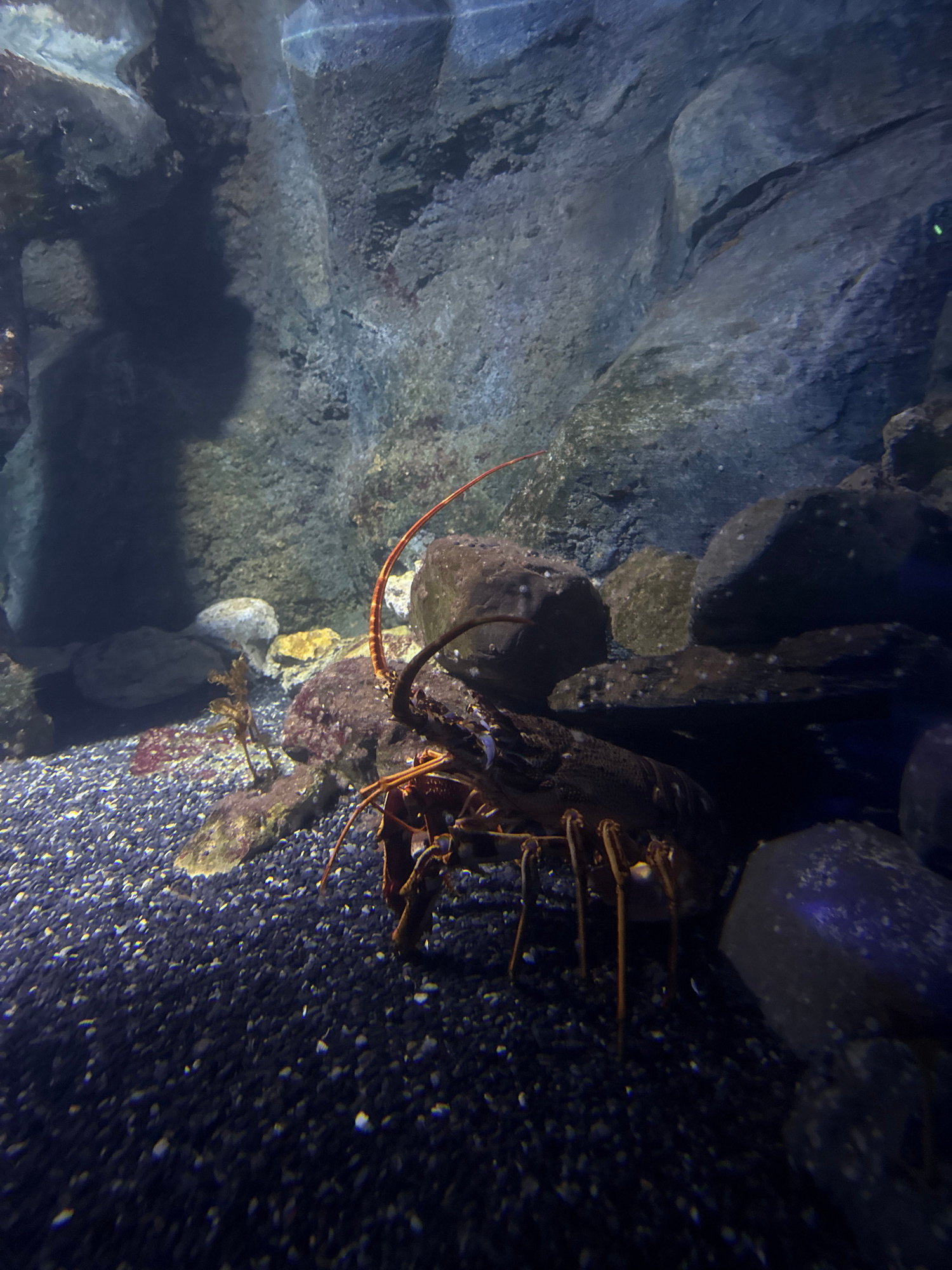 The image shows a lobster within an aquarium exhibit. The lobster is brown and located near rocks and a gravelly floor. The setting appears to be an artificial environment, possibly at the Sea Life Lo…read more
