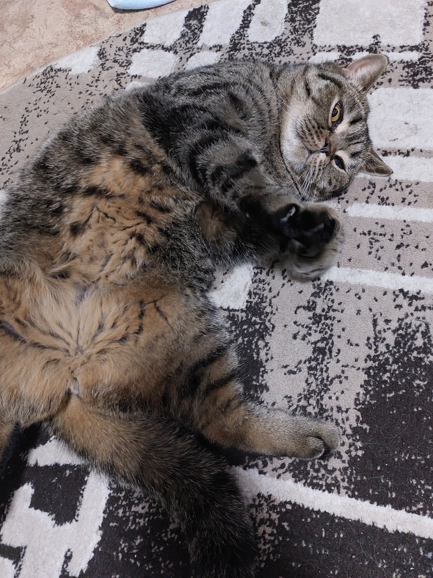 A brown tabby cat is lying on its back on a patterned rug. The rug has a black and white design with some gray areas. The cat's front paws are curled up near its chest. The cat is looking up and to th…read more