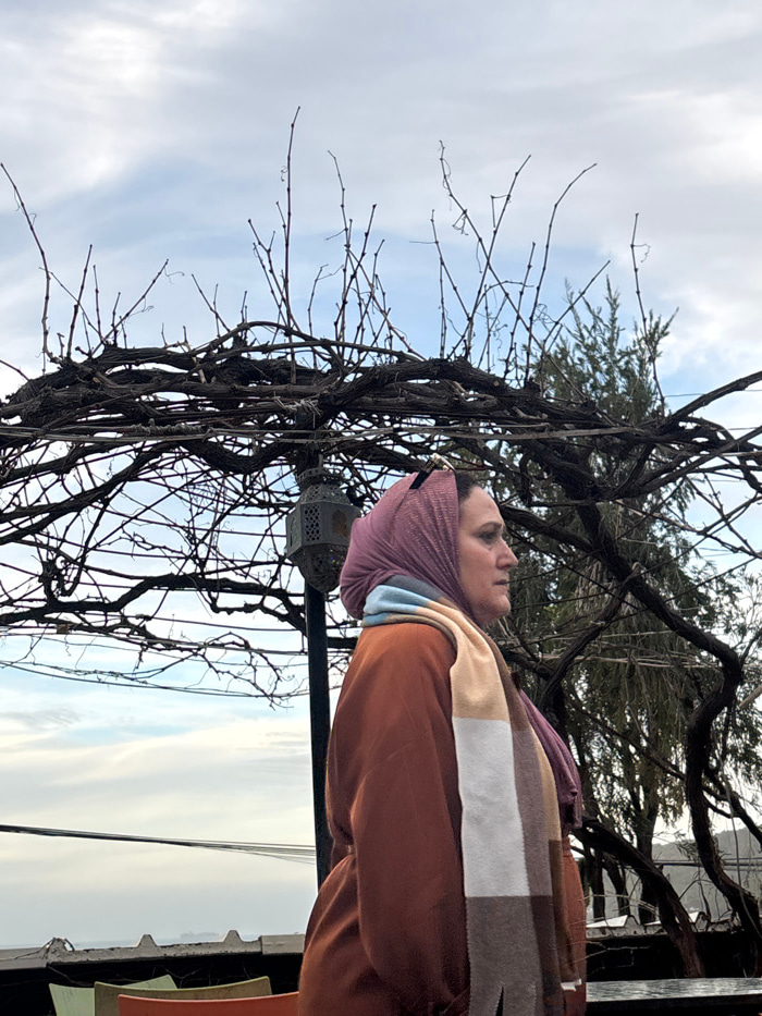 A person wearing a purple head covering and a multi-colored striped scarf stands outdoors. A bare tree with many branches and twigs stands to the left of the person. An ornate metal lantern is also vi…read more