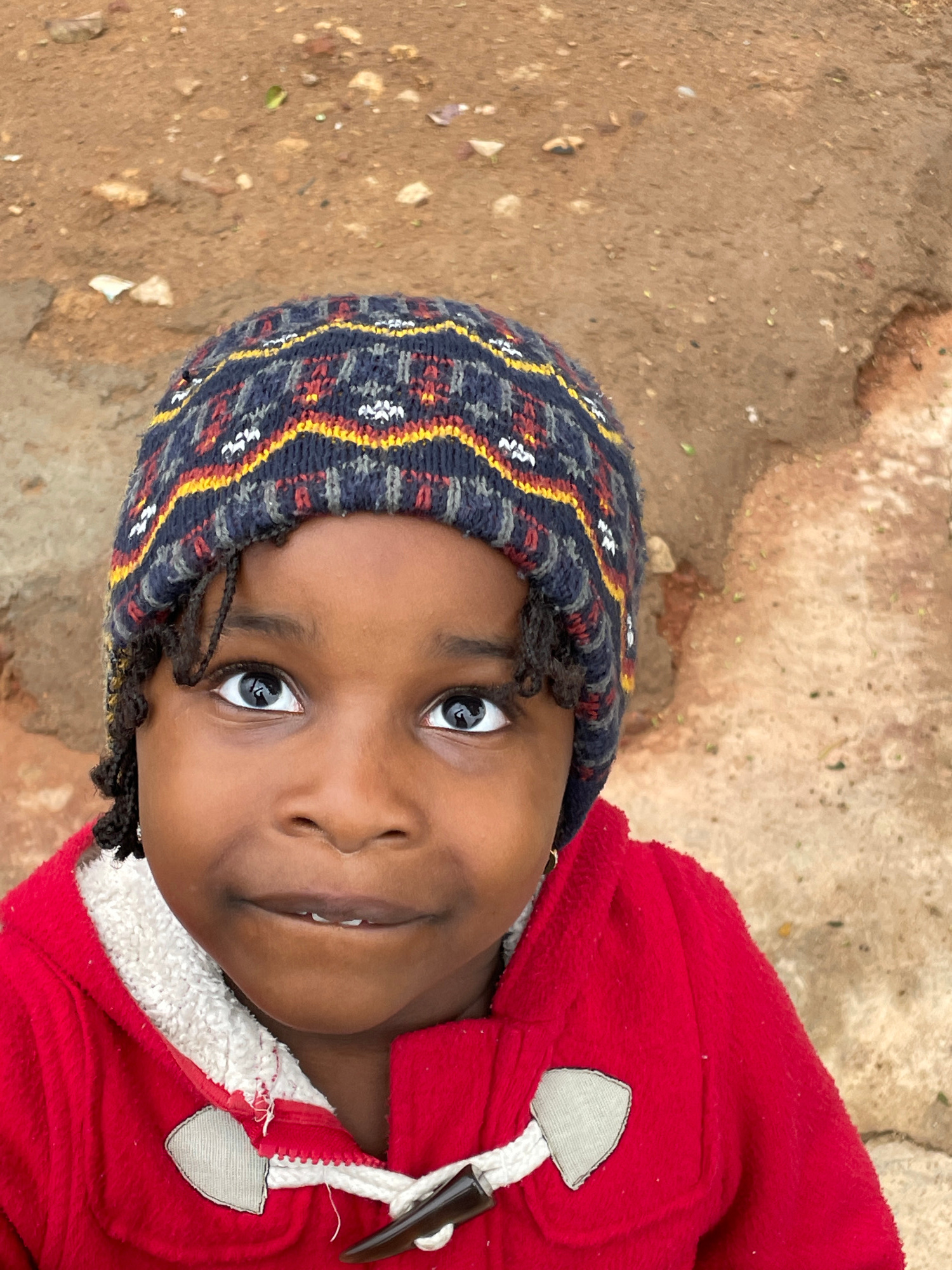 A close-up portrait shows a young child with dark skin and eyes looking up. She wears a patterned knit hat in shades of navy, yellow, red, and white, and a red hooded jacket with toggle closures. The…read more