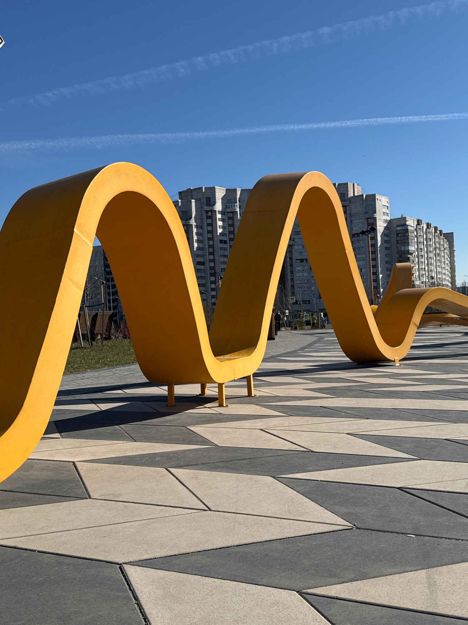 A low-angle, medium shot shows a curved, yellow sculpture installed on a patterned walkway against a backdrop of an urban environment under a clear, blue sky. The sculpture, resembling a stylized sin…read more