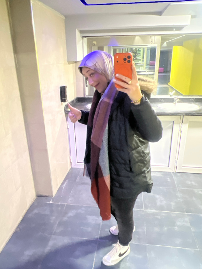 An individual is depicted indoors, taking a mirror selfie in what appears to be a public washroom facility located in Meknes, Morocco. The subject is a female, wearing a light-colored patterned hijab,…read more