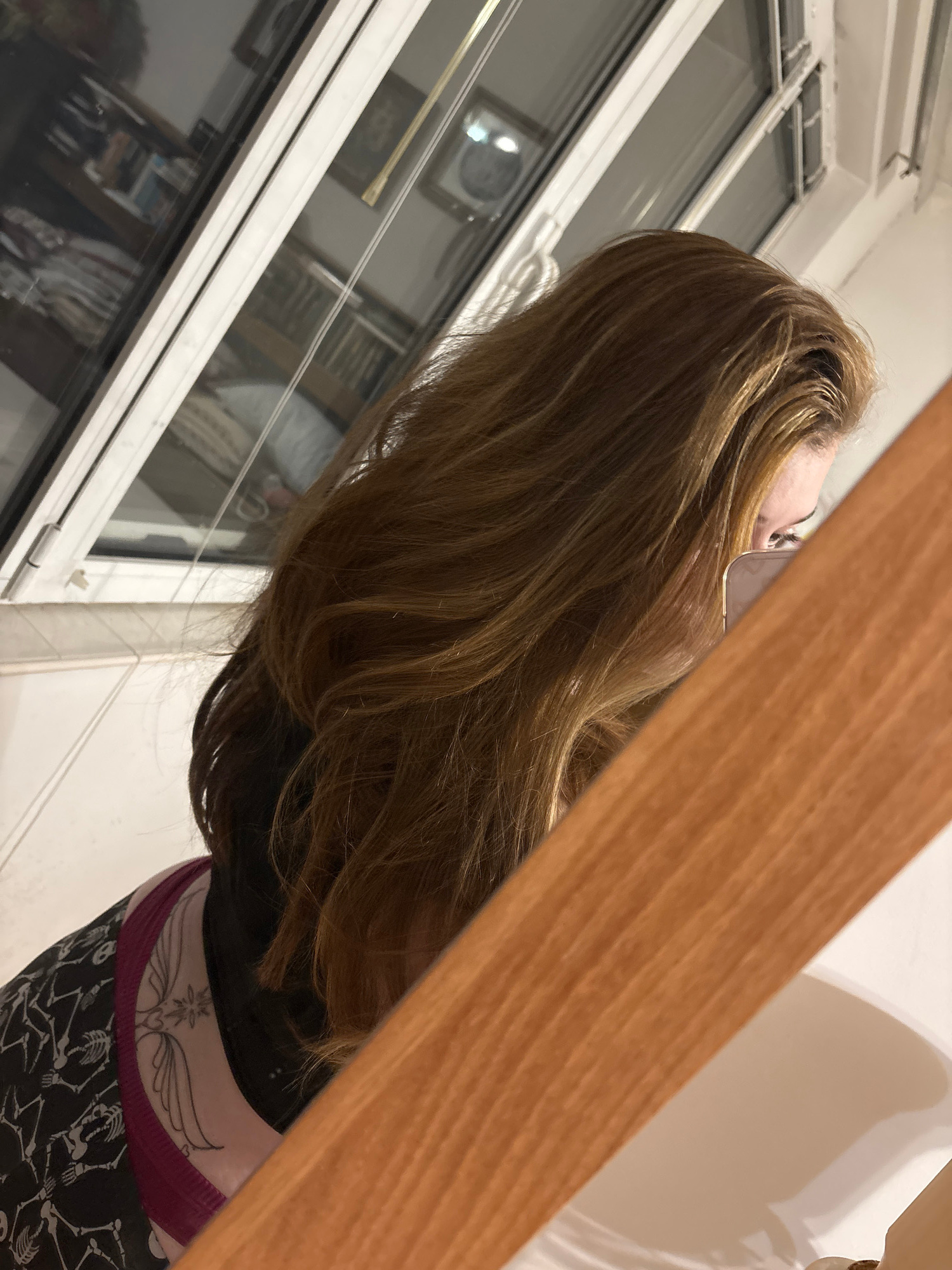 A woman with long brown hair is visible from the chest up, with a partial view of a wooden object in the foreground. She is wearing a black top and patterned leggings. A window with multiple panes and…read more