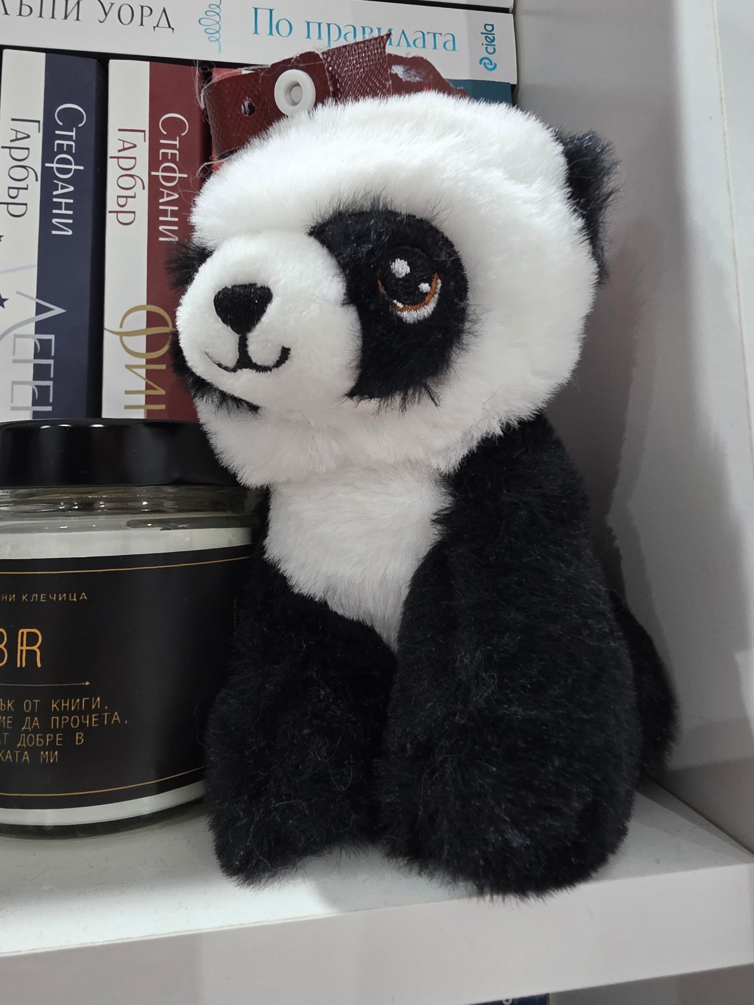 A plush panda toy lies atop a stack of books and a jar inside a white shelf. The books appear to be in Bulgarian, with the author "Стефани Гарбър" visible on two spines. A brown object with a grommet,…read more