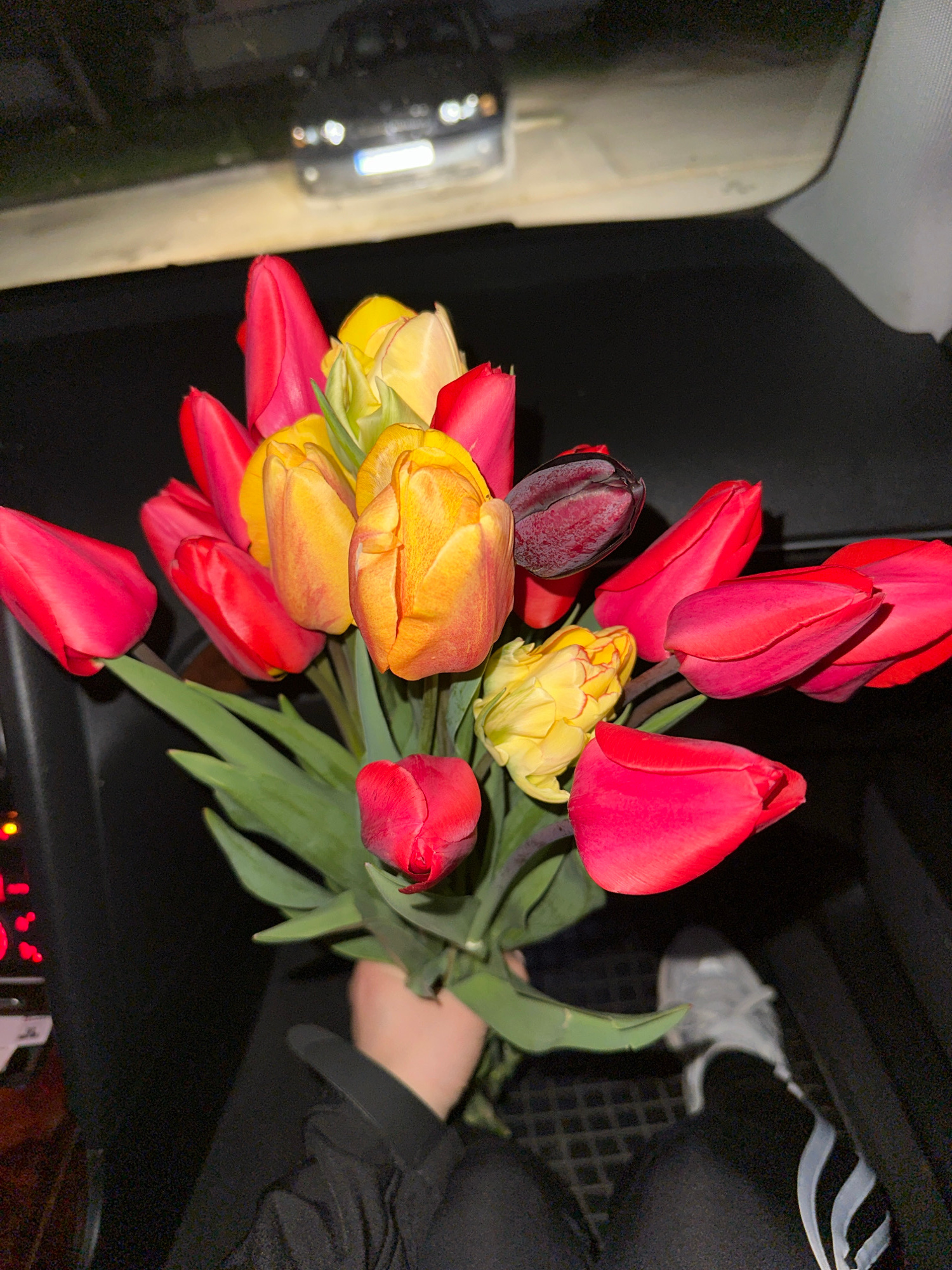 A close-up shot shows a bouquet of red, yellow, and one dark burgundy tulip. The flowers have green leaves. The background is dark, revealing parts of a car interior including a beige-colored door pan…read more