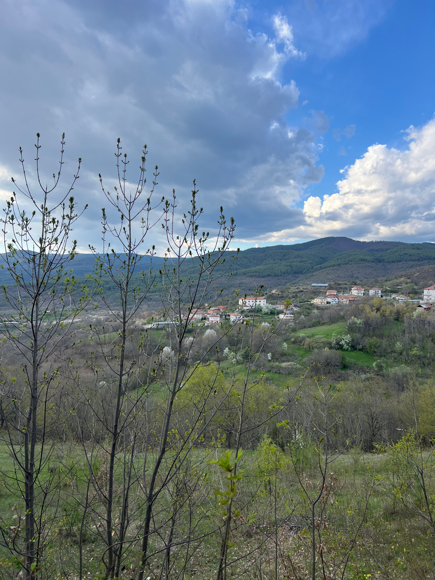 The image captures a view in Kribul, Bulgaria, featuring a hillside village nestled against a mountain. The sky is a mix of blue and dramatic clouds. Bare tree branches with budding leaves dominate th…read more