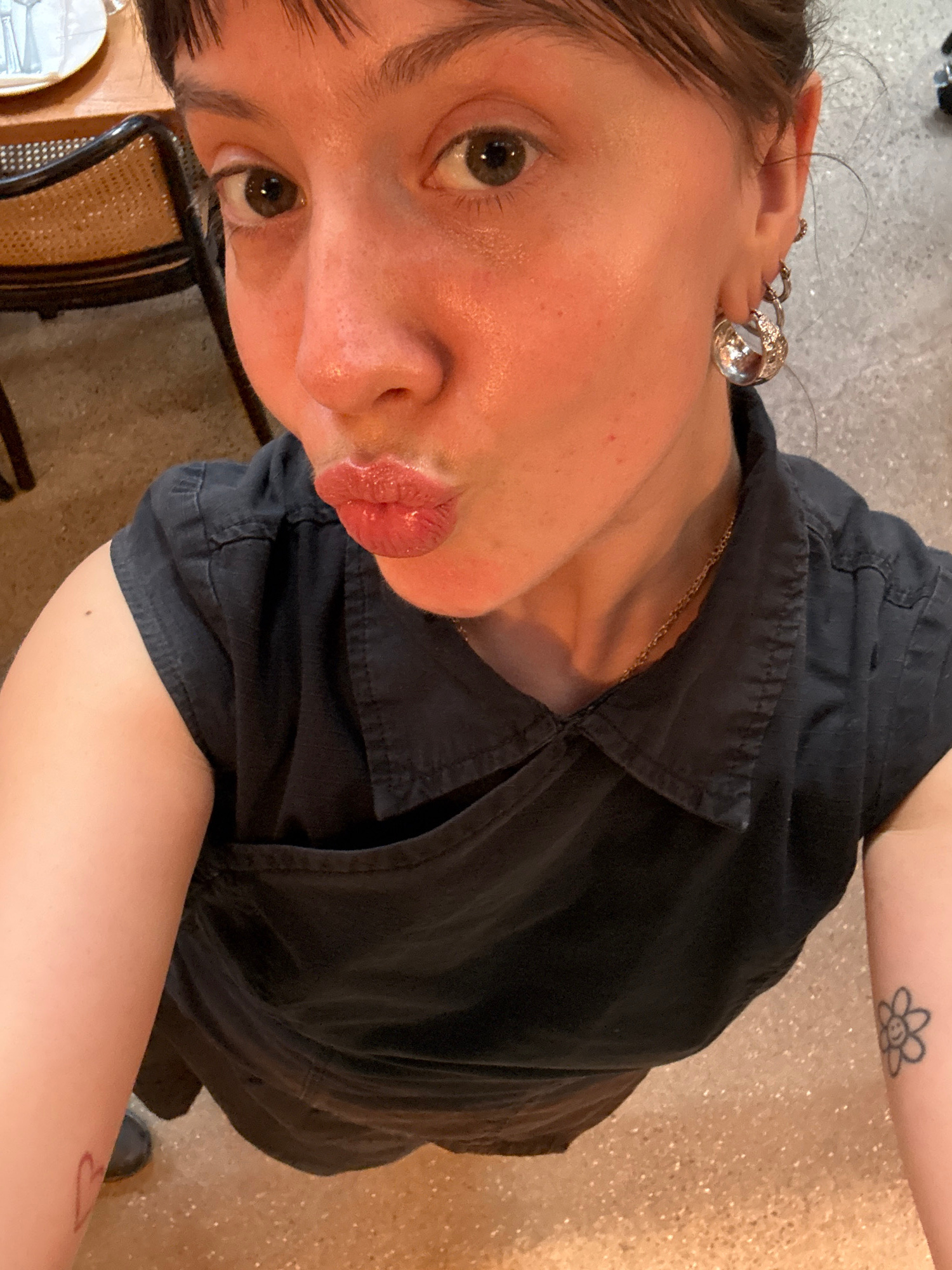 A young individual is captured in a high-angle selfie, looking downwards towards the camera with a playful expression. The subject, likely female, has fair skin, dark brown or hazel eyes, and short, d…read more