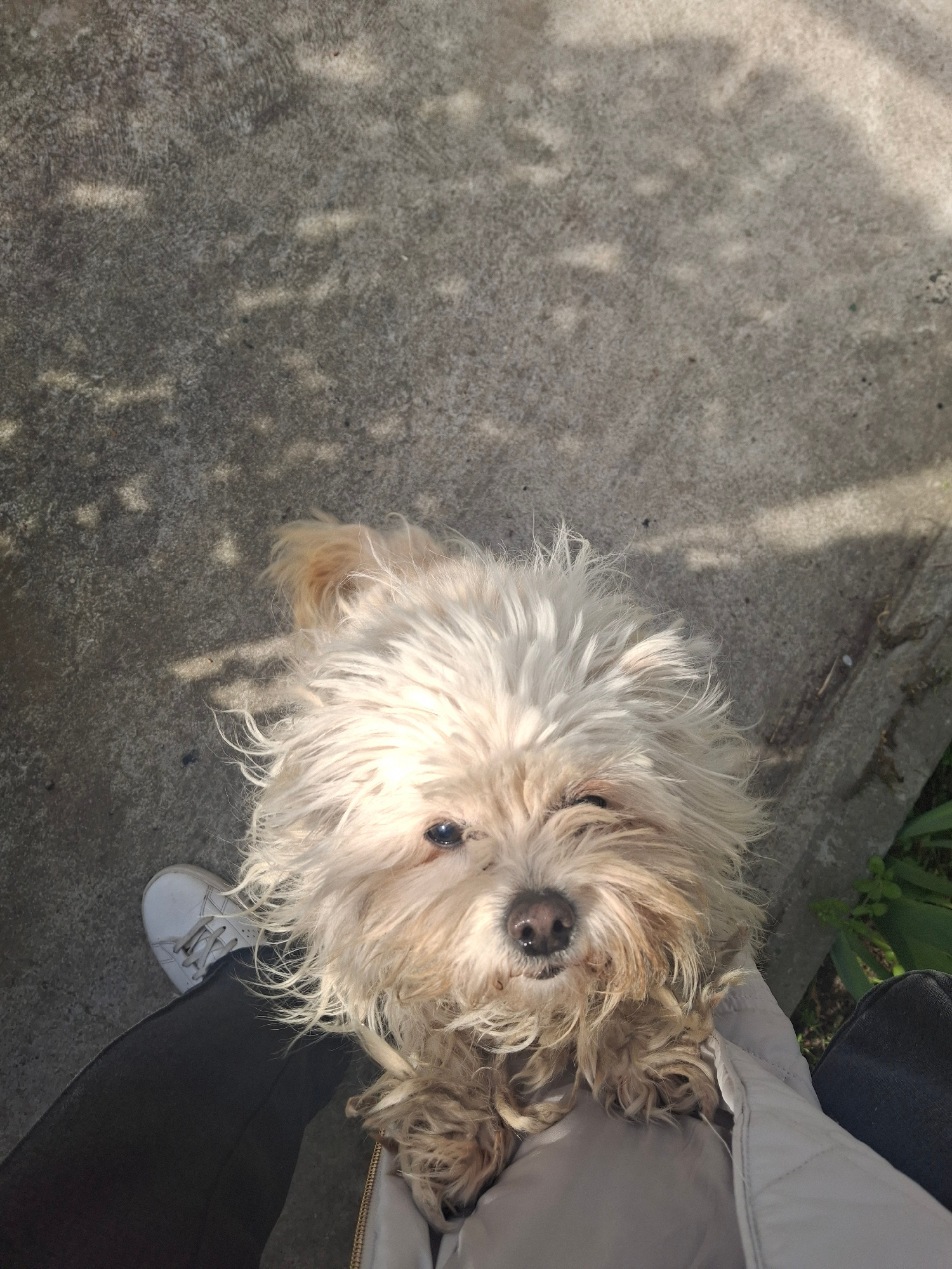 A close-up, high-angle shot shows a small, shaggy dog standing on a concrete surface, next to a person wearing white sneakers, dark pants, and a light-colored jacket. The dog is predominantly light-co…read more