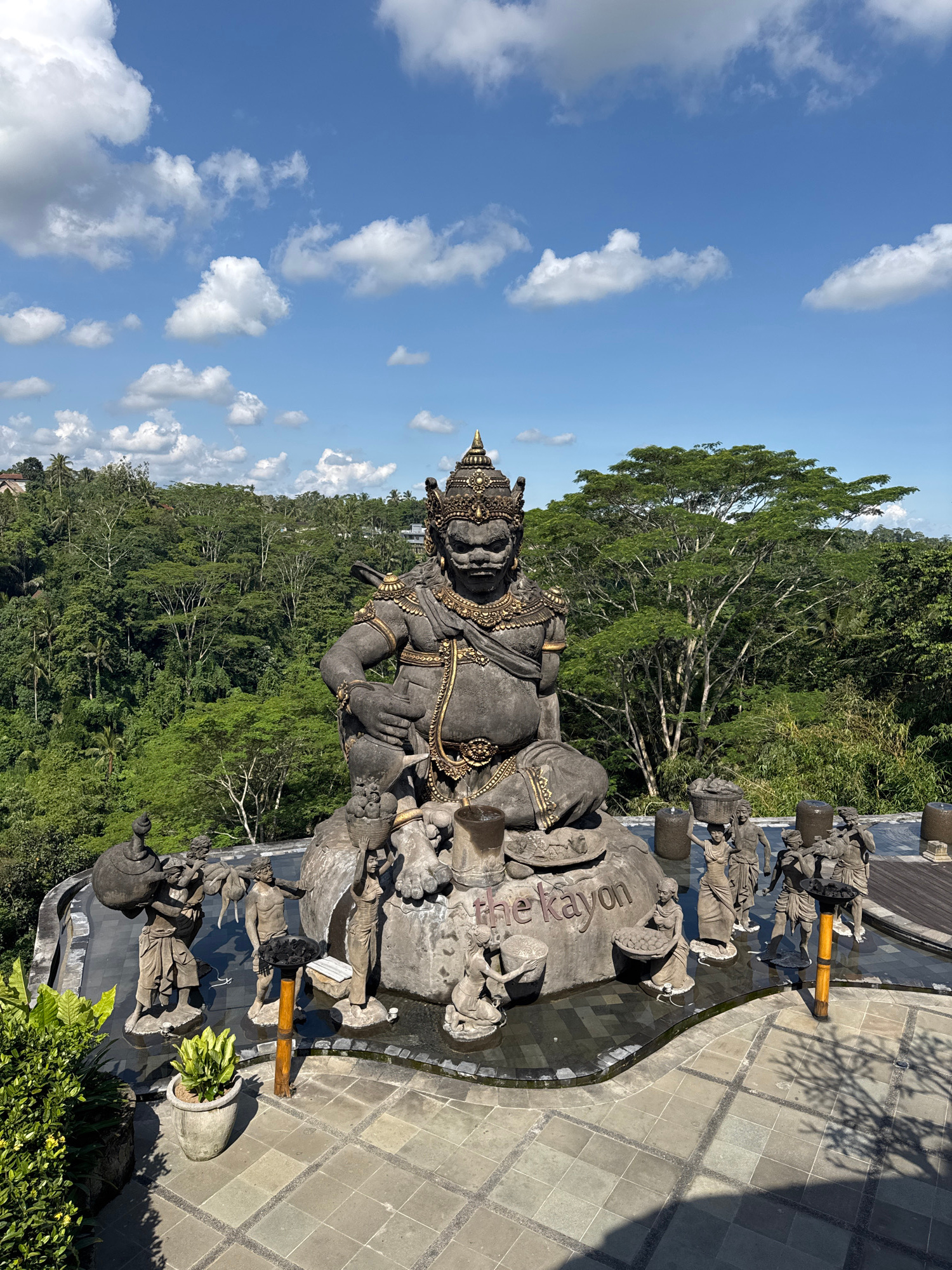 The image shows a large stone statue in Payangan, Indonesia. The statue is ornately decorated with gold accents and depicts a figure in a seated position. The base of the statue is surrounded by other…read more