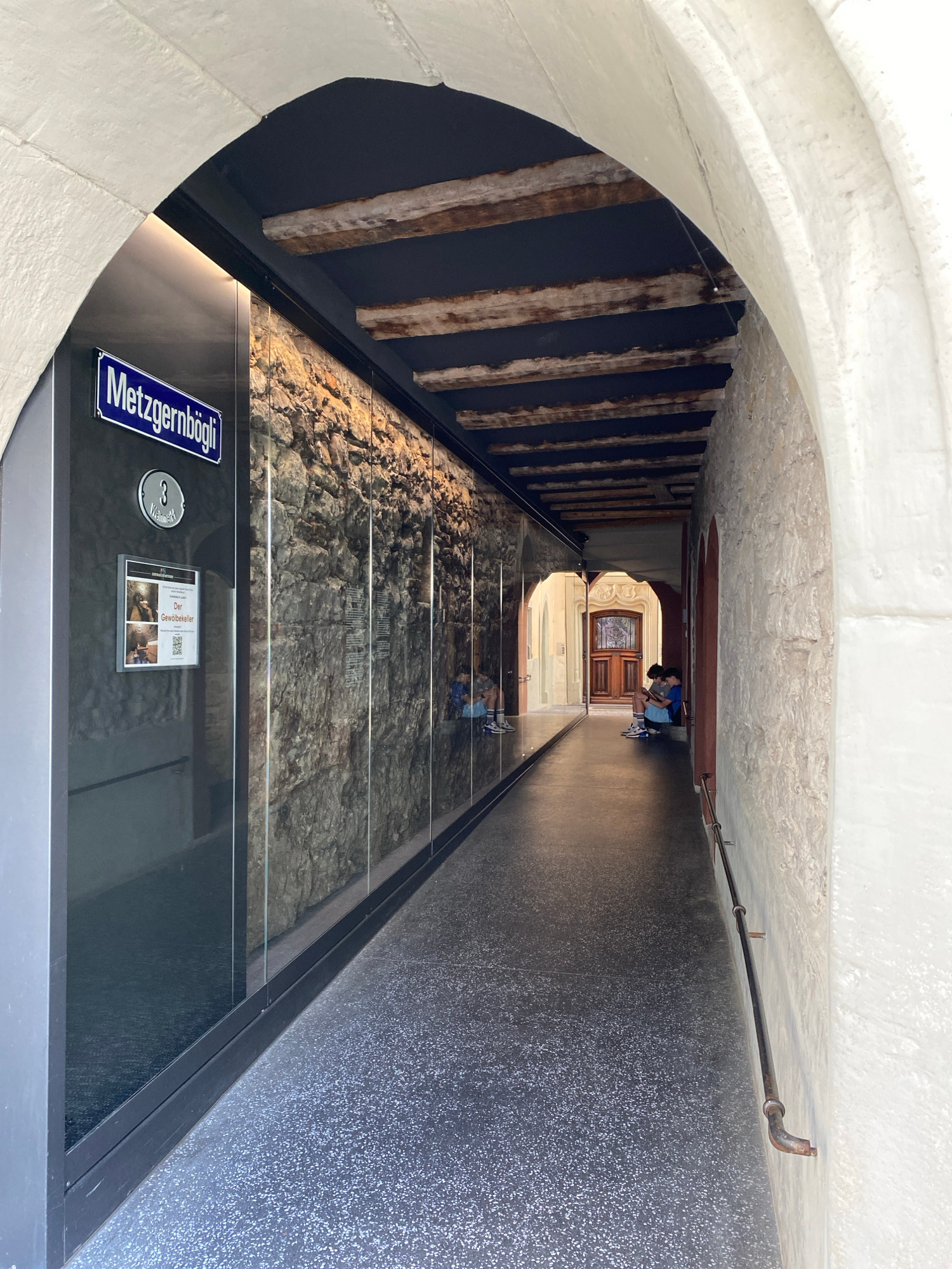 This image depicts a narrow, arched passage or underpass, likely in an urban setting. The perspective looks along the length of the passage, which features a modern glass floor covering an excavated a…read more