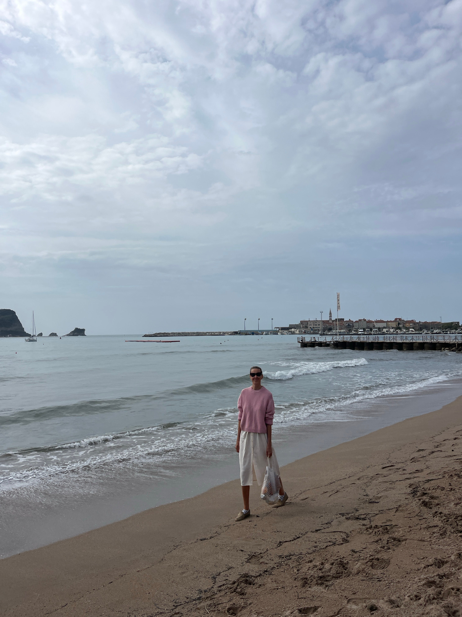A person stands on the sandy beach in Budva, Montenegro, facing the sea. The individual is wearing a pink sweater and white pants, and holding a net bag. The beach is to the person's right, and the se…read more