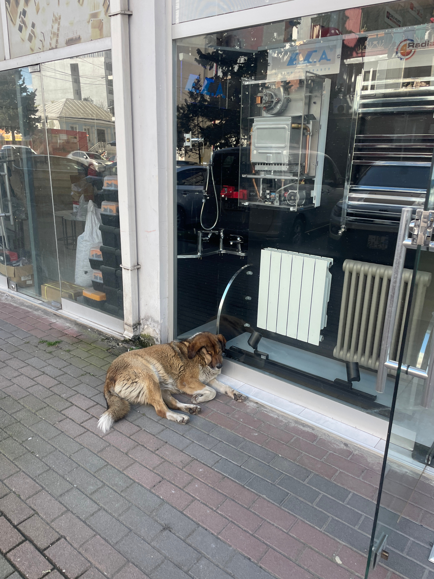 The image depicts a tan-colored dog lying on a brick sidewalk in front of a storefront in Batumi, Georgia. The storefront window displays heating and plumbing equipment. The dog is positioned between…read more