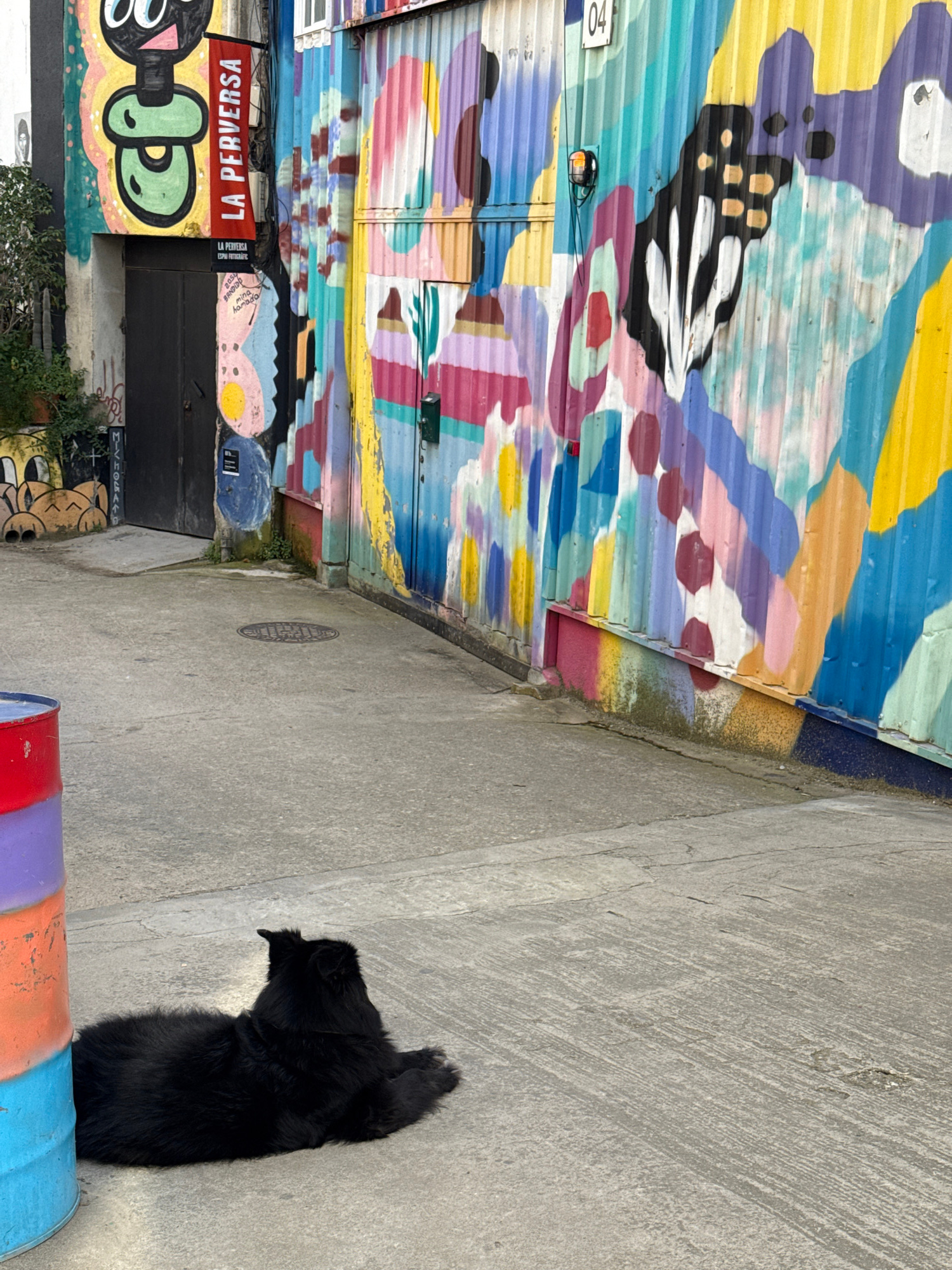 The image depicts a narrow alleyway in Barcelona, Spain, characterized by vibrant, colorful graffiti art adorning the walls. The artwork includes abstract patterns and cartoonish figures. A black dog…read more