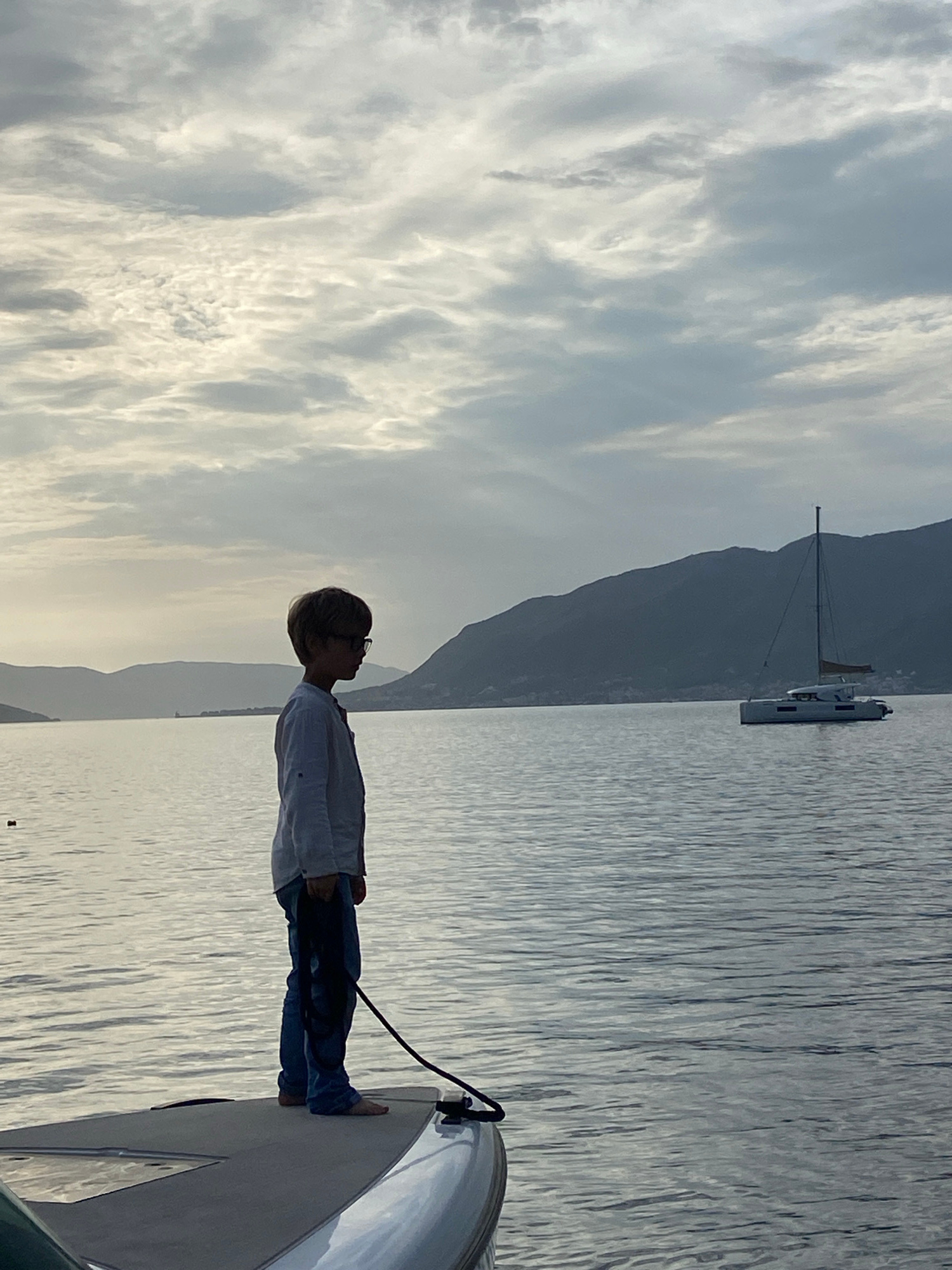 A landscape-oriented photograph captures a scene at the city of Tivat, Montenegro. A boy stands on the bow of a boat, wearing a light-colored shirt, dark pants, and glasses. To the left, puffy white c…read more