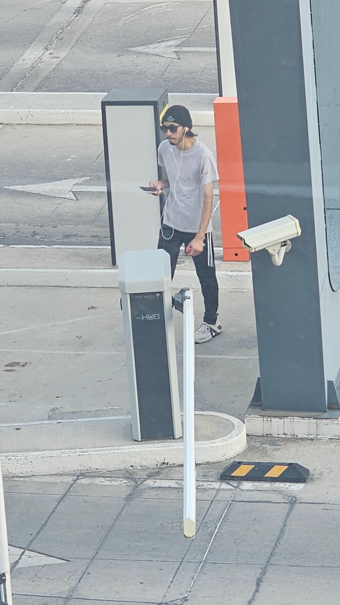 A man in a grey t-shirt, black pants, sunglasses, and a black beanie is standing on a structure that appears to be a parking booth. He is holding a smartphone in his right hand and wearing white headpβ¦read more