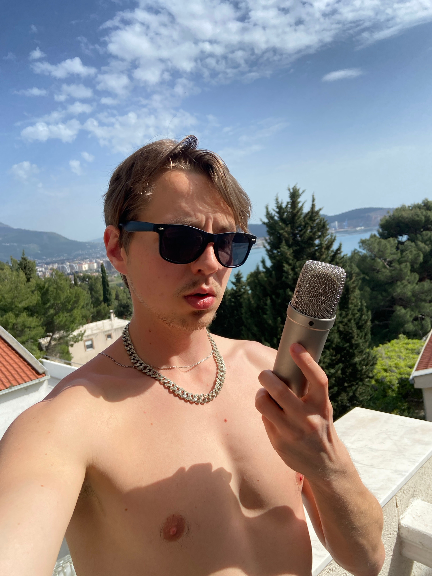 A shirtless man with sunglasses and a silver chain holds a microphone in his right hand. The background includes a cityscape with trees, mountains, and a body of water. The location is likely Šušanj,…read more