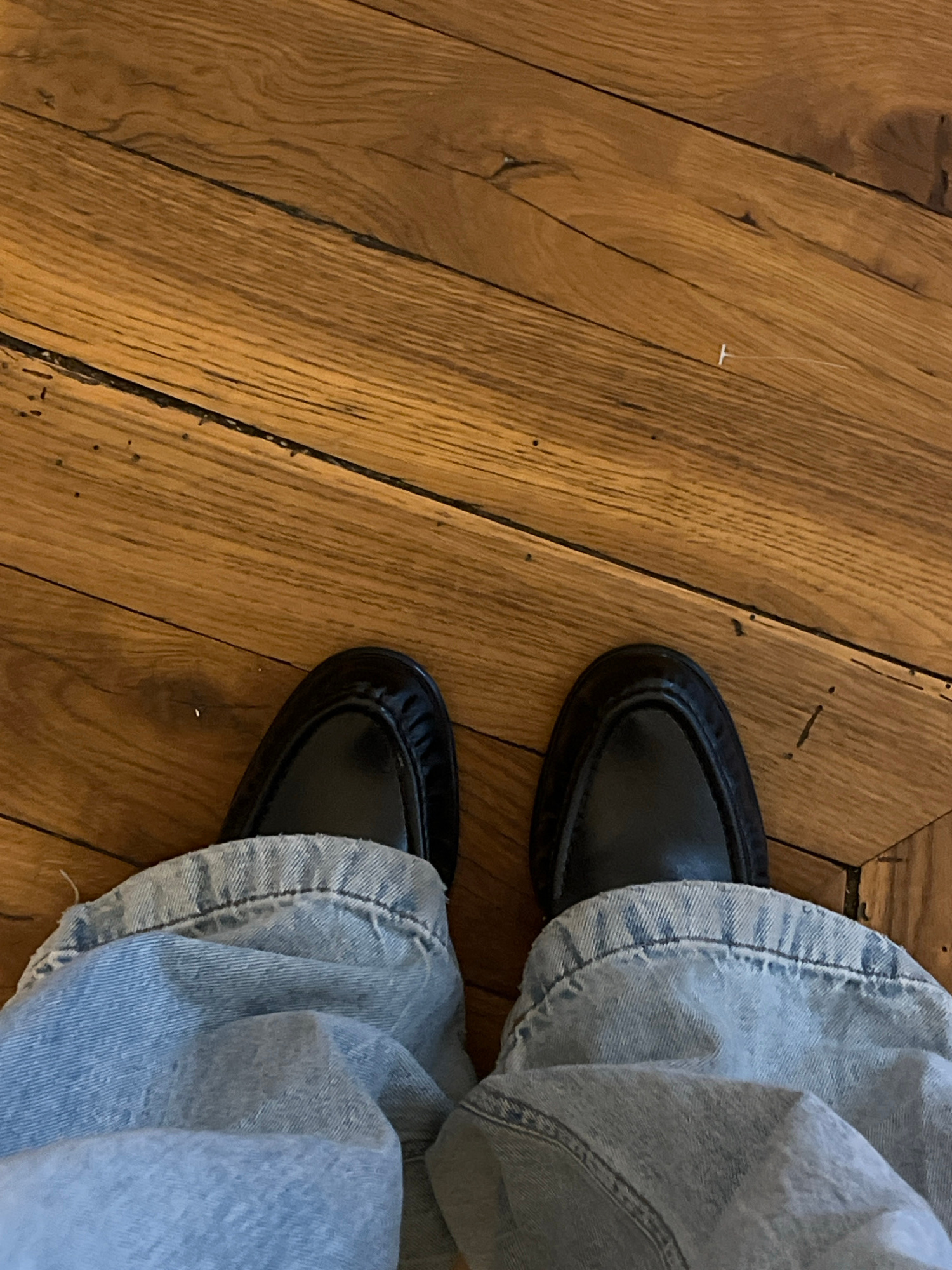 The image presents a low-angle, first-person perspective looking down at a person's feet on a wooden floor. The visible subjects include two feet, shod in black shoes that appear to be loafers or flat…read more