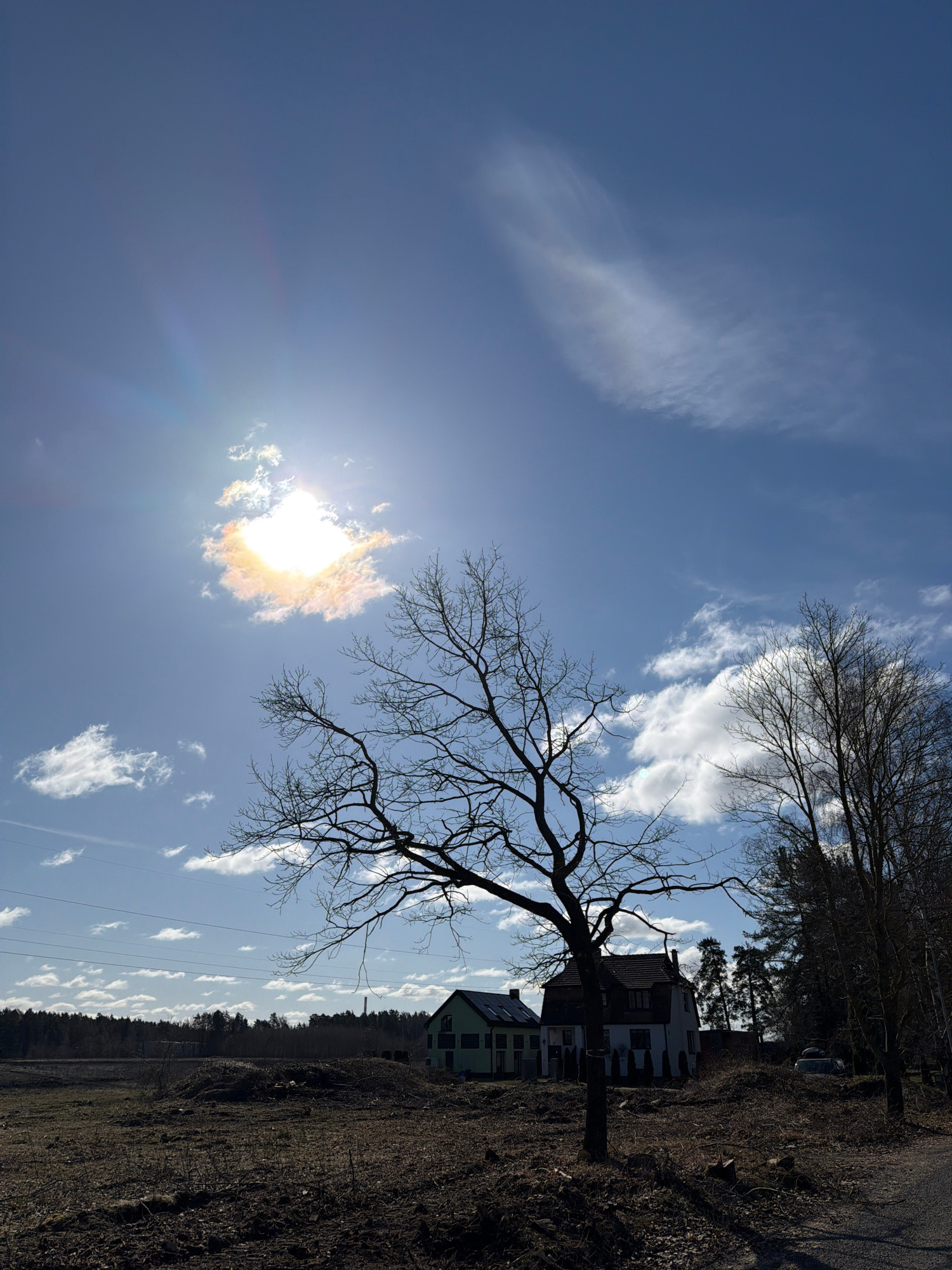 The image depicts a clear sky with scattered clouds and the sun shining brightly. A bare tree stands prominently in the foreground, its branches reaching across the frame. A building is visible behind…read more