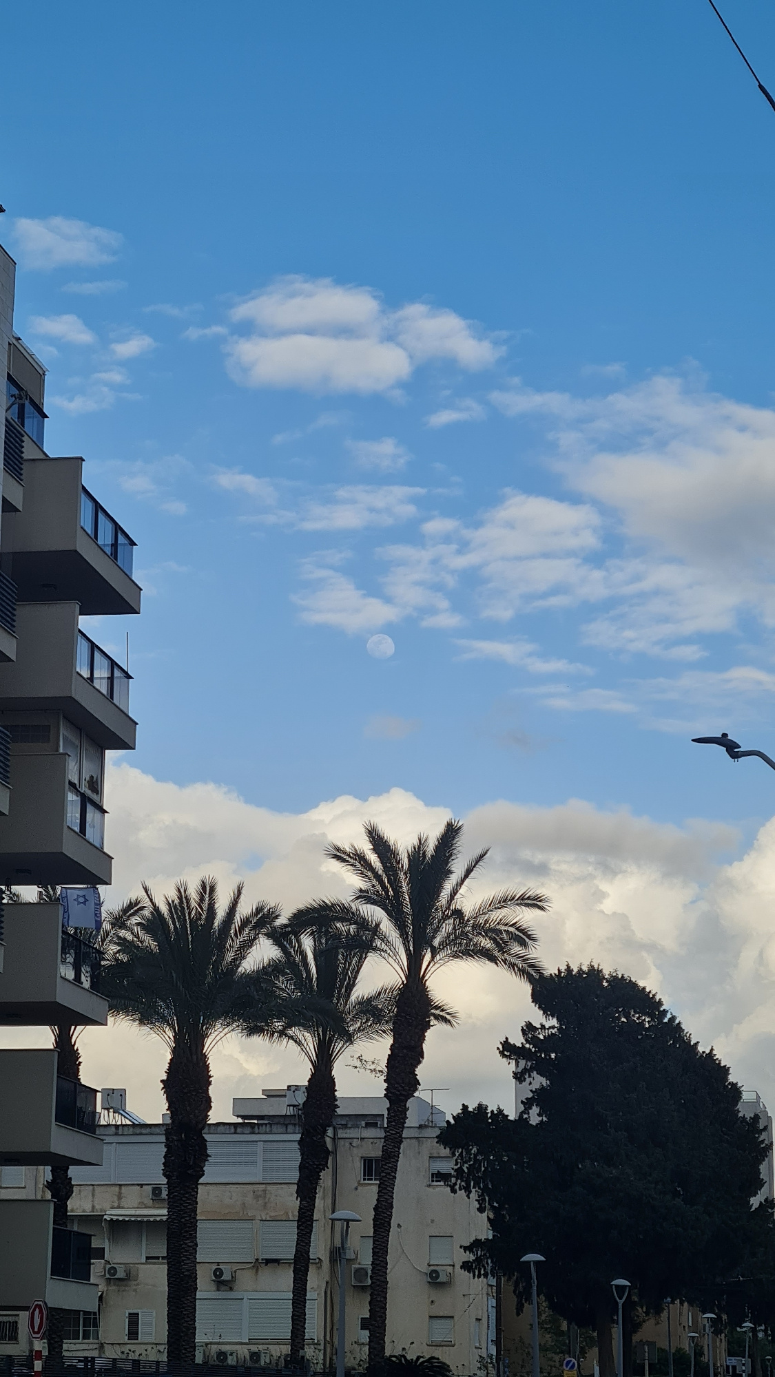 The image captures a view from Nahariyya, Israel, looking upwards toward the sky. The sky is primarily blue with scattered white clouds, with some darker, denser cloud formations on the right side of…read more