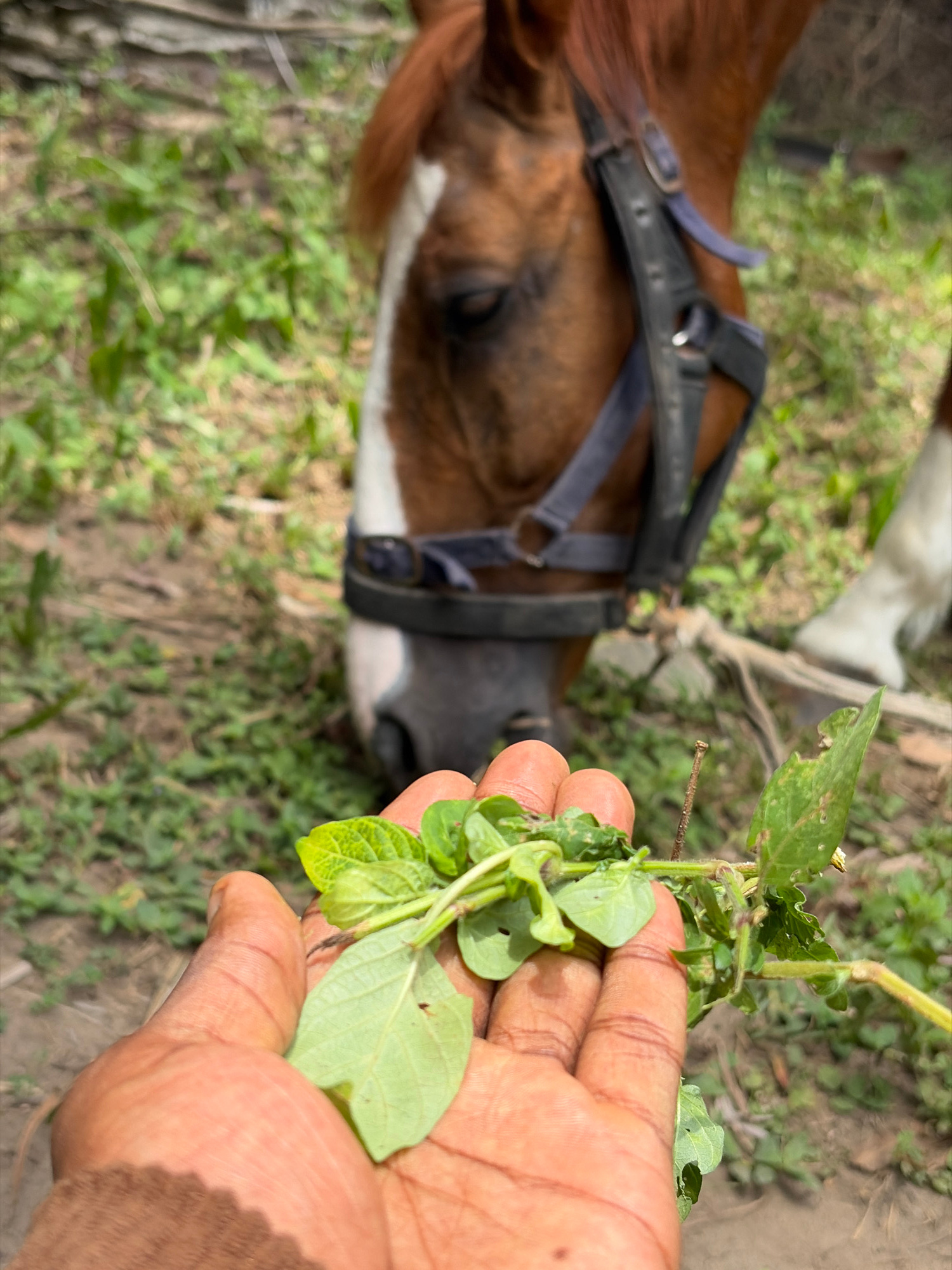 This image, captured in Lekki, Nigeria, depicts an outdoor interaction between a human and a horse. In the foreground, a dark-skinned human hand, partially obscured by a brown sleeve, holds a small cl…read more