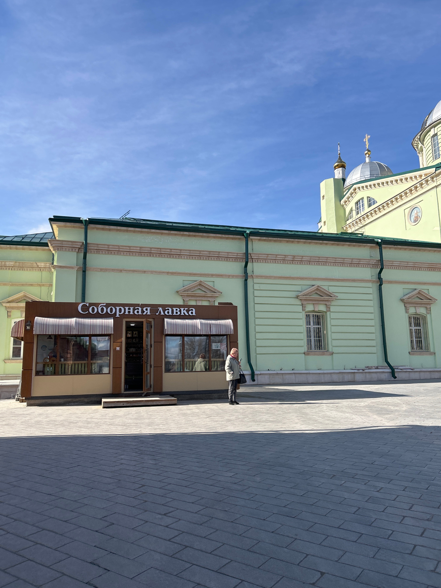 A vertical, wide-angle photograph shows a building in Klin, Russia, under a clear blue sky. A portion of the building's exterior is light green with beige trim and architectural details such as triang…read more
