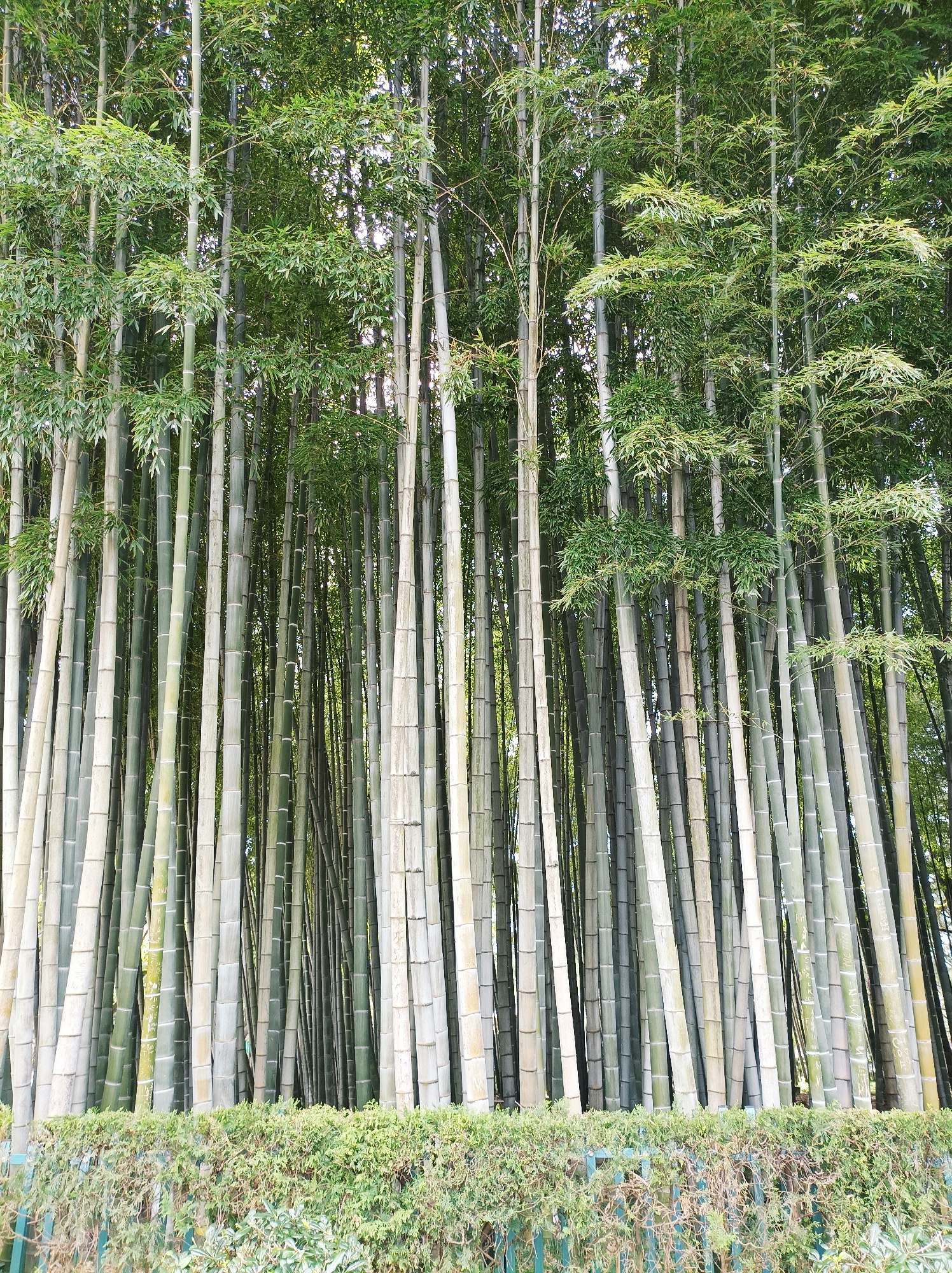 A dense stand of bamboo trees, of varying shades of green and grey, fills most of the frame. The bamboo trunks rise vertically from a low, trimmed hedge of green foliage along the bottom edge of the i…read more