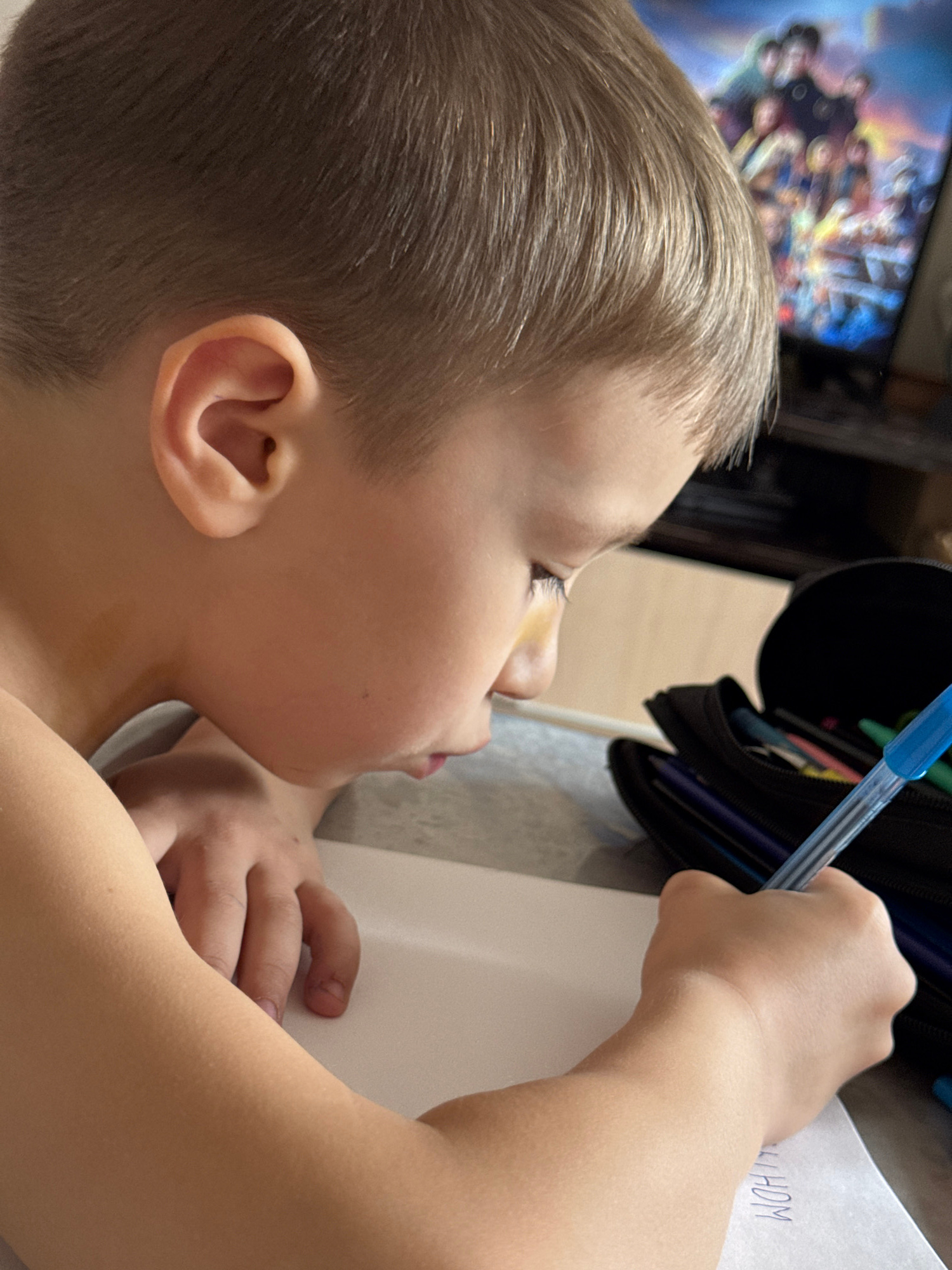A young child is writing on a piece of paper with a blue pen. The child has light brown hair and is viewed in profile. A pencil case containing various colored writing implements is located near the p…read more