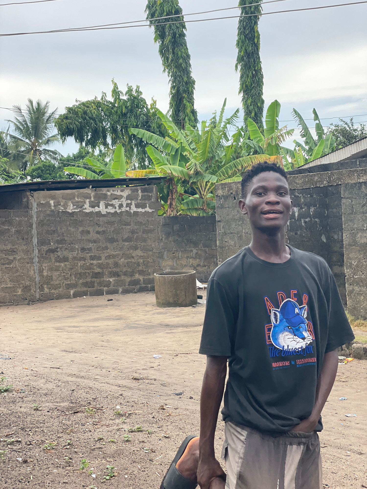 The image shows a young man in Badagry, Nigeria. He is standing on a dirt surface next to a concrete block wall. He is wearing a dark t-shirt with a graphic and light-colored shorts. A concrete cylindβ¦read more