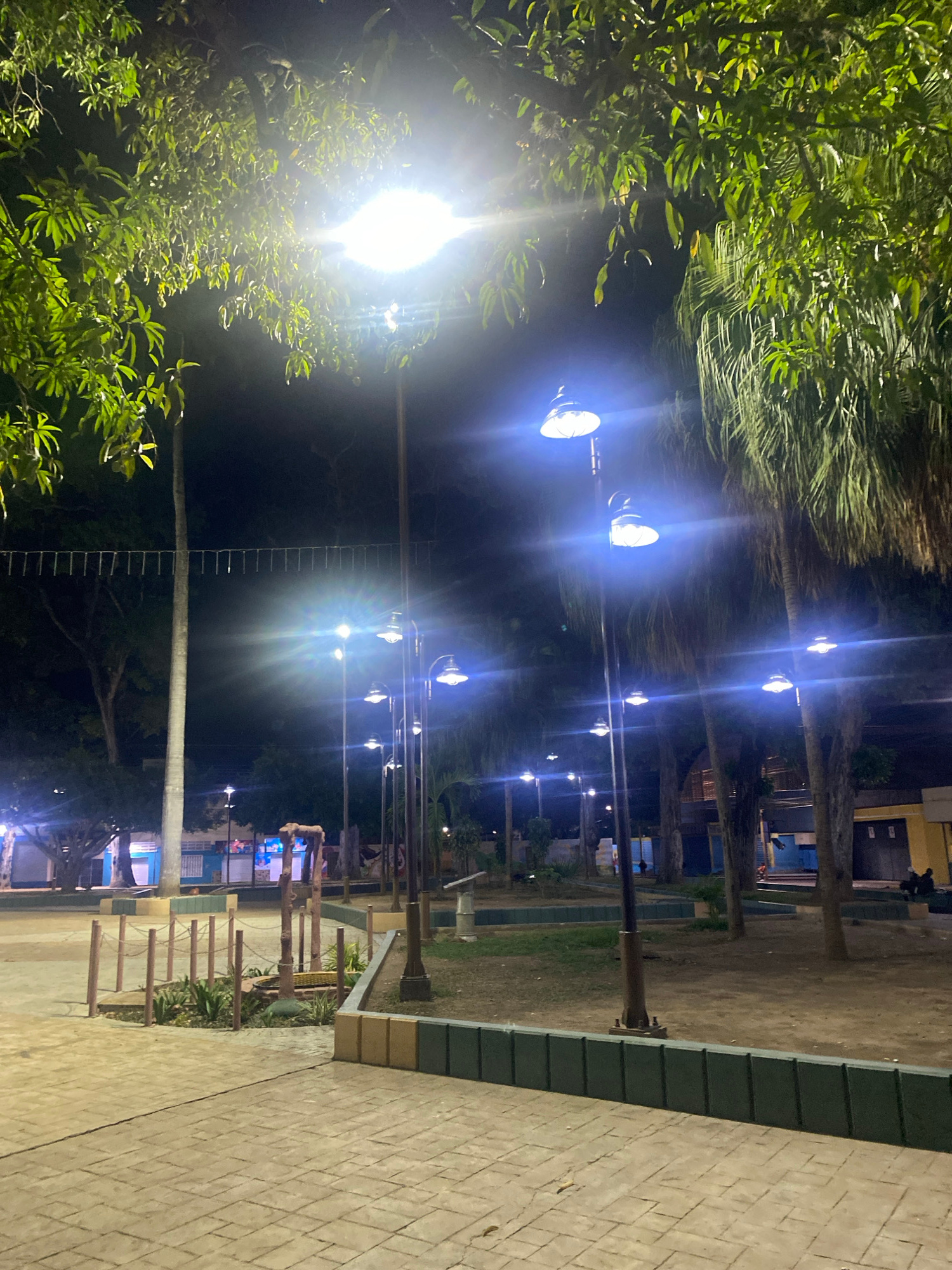This nighttime image depicts a row of illuminated streetlights lining a pedestrian pathway in Tinaquillo, Venezuela. Lush, dark green trees obscure some of the lights and the darkness of the night sky…read more