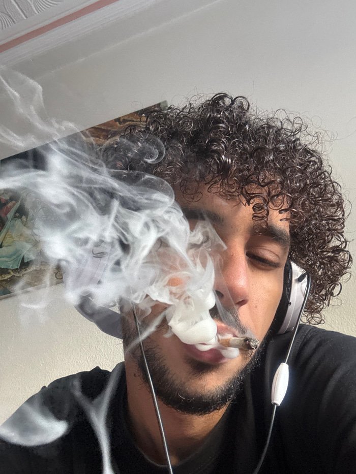 This close-up image depicts a male individual in Tangier, Morocco. He has dark, curly hair, light skin, and a beard/stubble, with his eyes closed. A hand-rolled cigarette is held between his lips, relβ¦read more