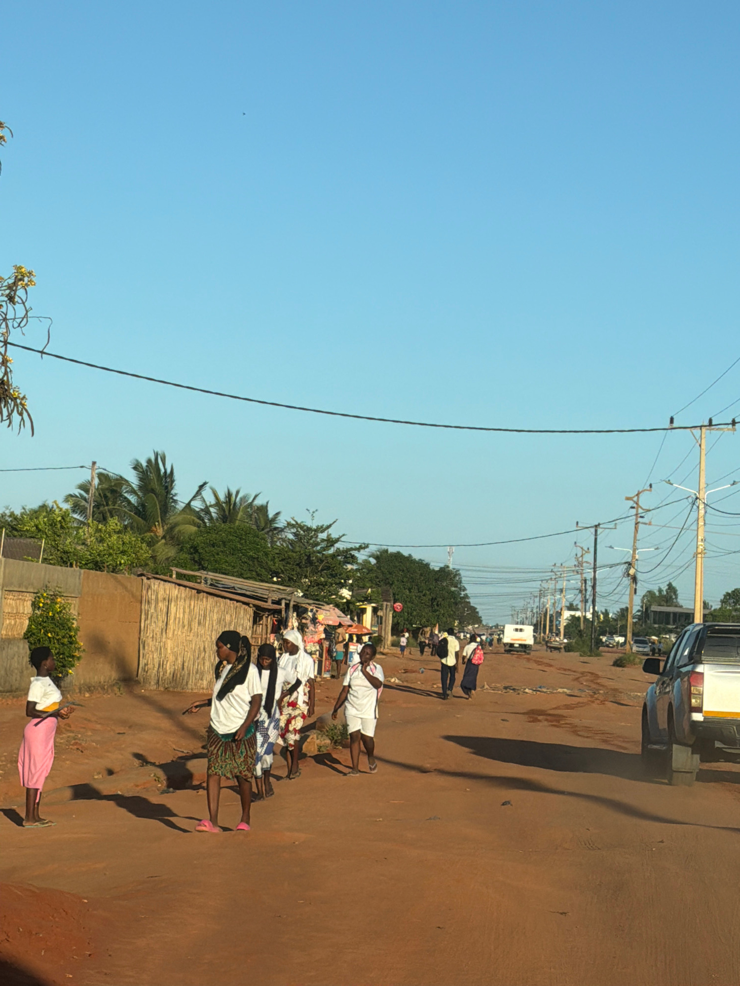 This image depicts a sunlit, unpaved red dirt road in what appears to be Pemba, Mozambique. A clear, bright blue sky dominates the upper portion of the scene. Along the right side of the road, numero…read more