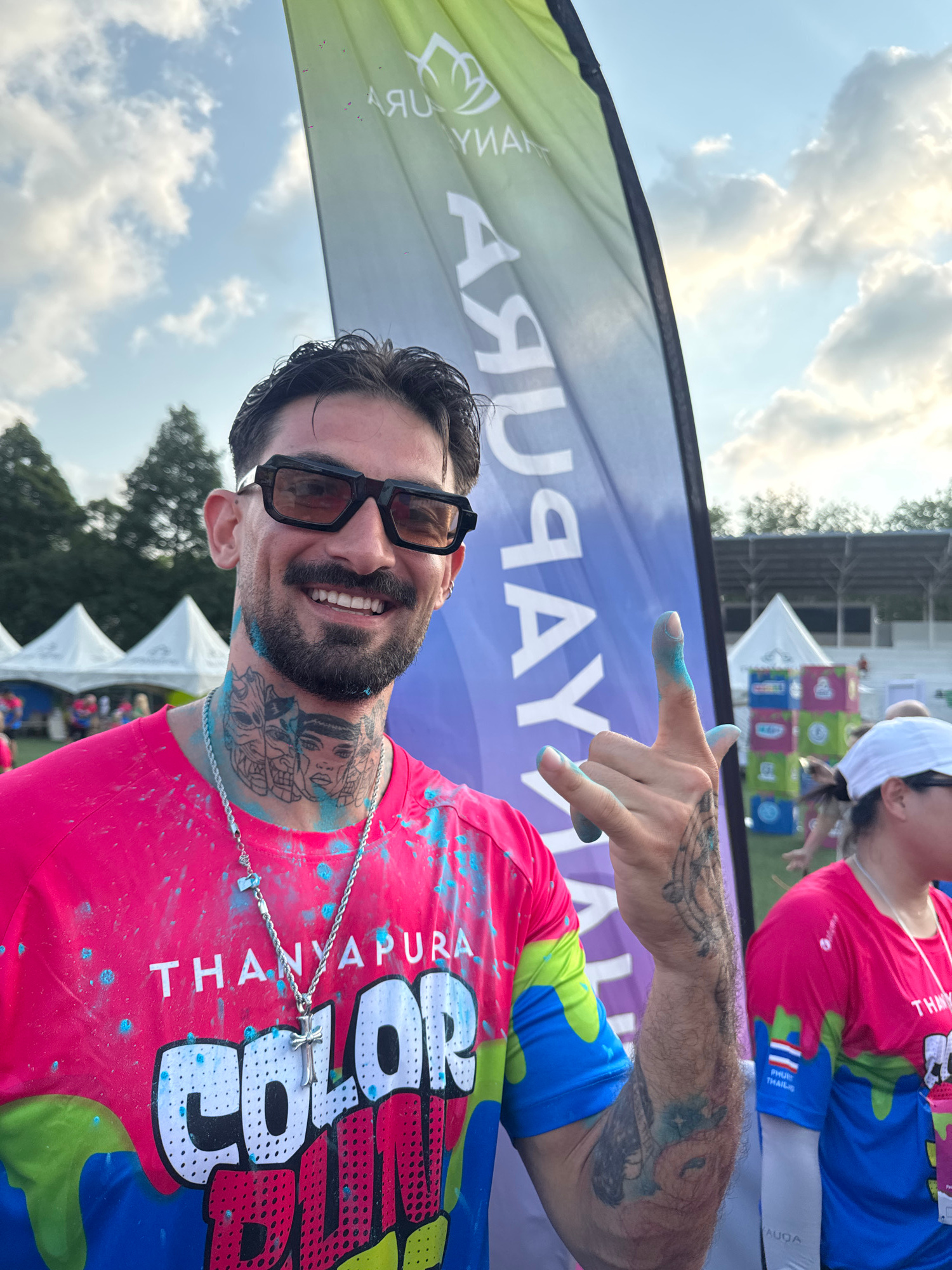The image depicts a man with a beard, wearing glasses and a pink T-shirt with the words "Color Thanayapura" splattered with blue paint. He is holding up two fingers covered in blue paint, indicating t…read more