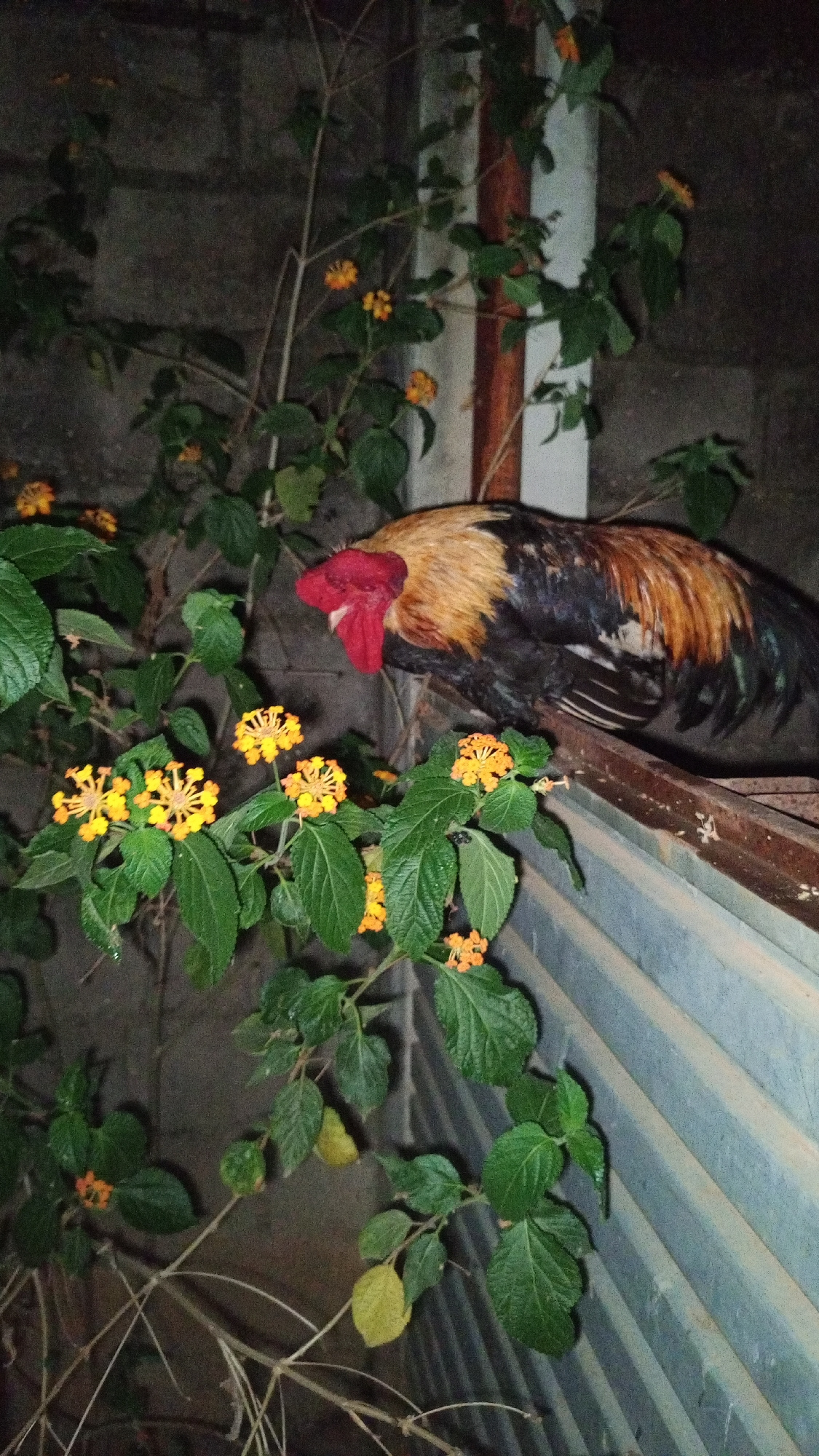 A rooster is perched on the edge of a corrugated metal structure, next to a flowering plant with yellow and orange blooms. The background is a dark, possibly brick wall. The location is Tinaquillo, Ve…read more