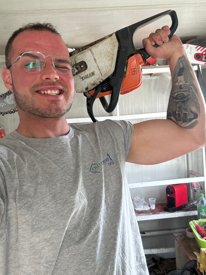 An adult male is depicted indoors, posing for a selfie. He is smiling broadly, with his left eye slightly squinted, and his face appears flushed. He is Caucasian, with short dark hair, light facial st…read more